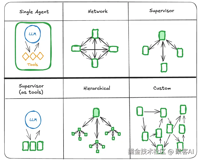 - 主管模式:所有智能体通过一个中心主管(Supervisor)进行协调,结构清晰,易于控制。