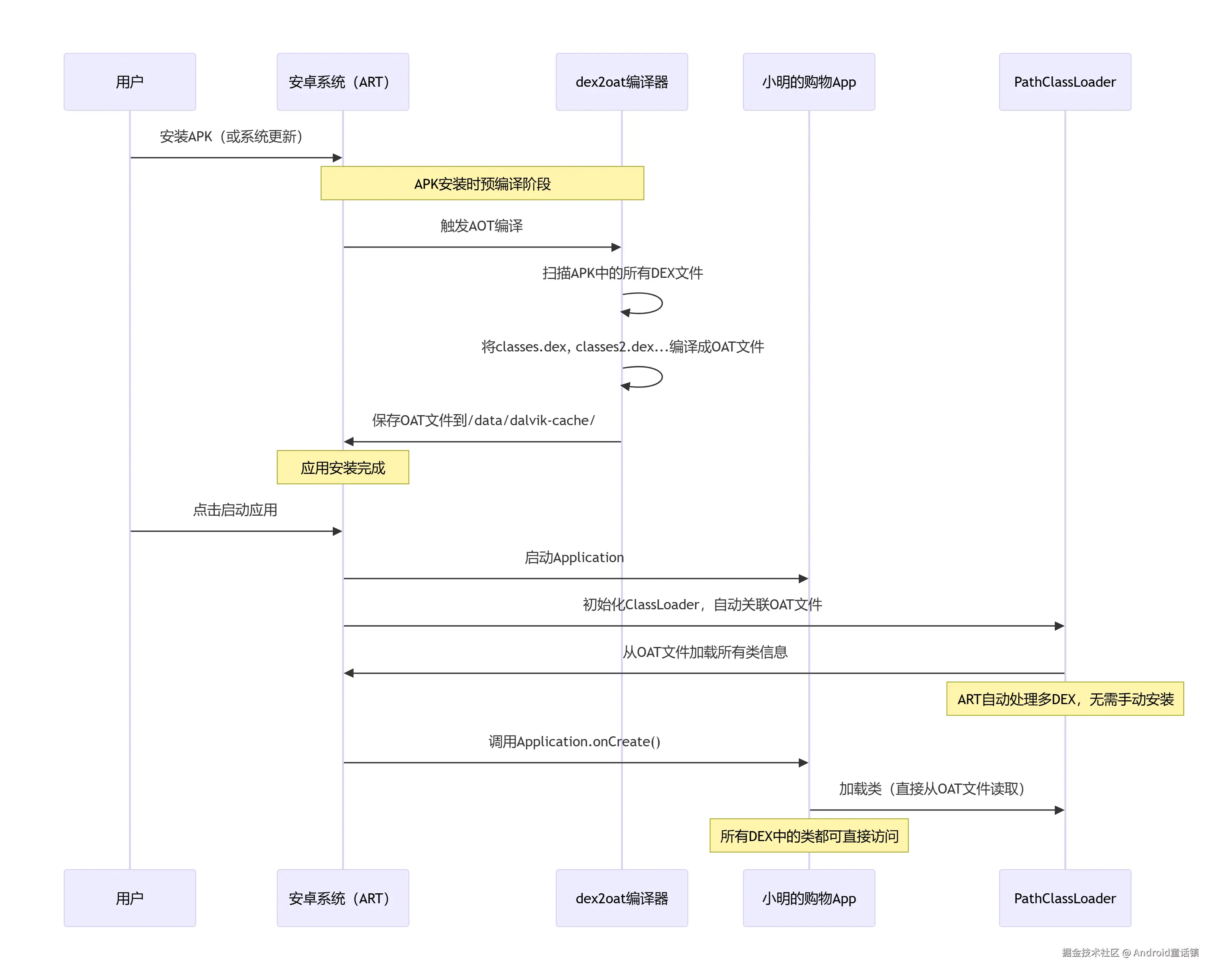 dex2oat->>dex2oat: 把所有DEX(classes1~n.dex)编译成OAT文件