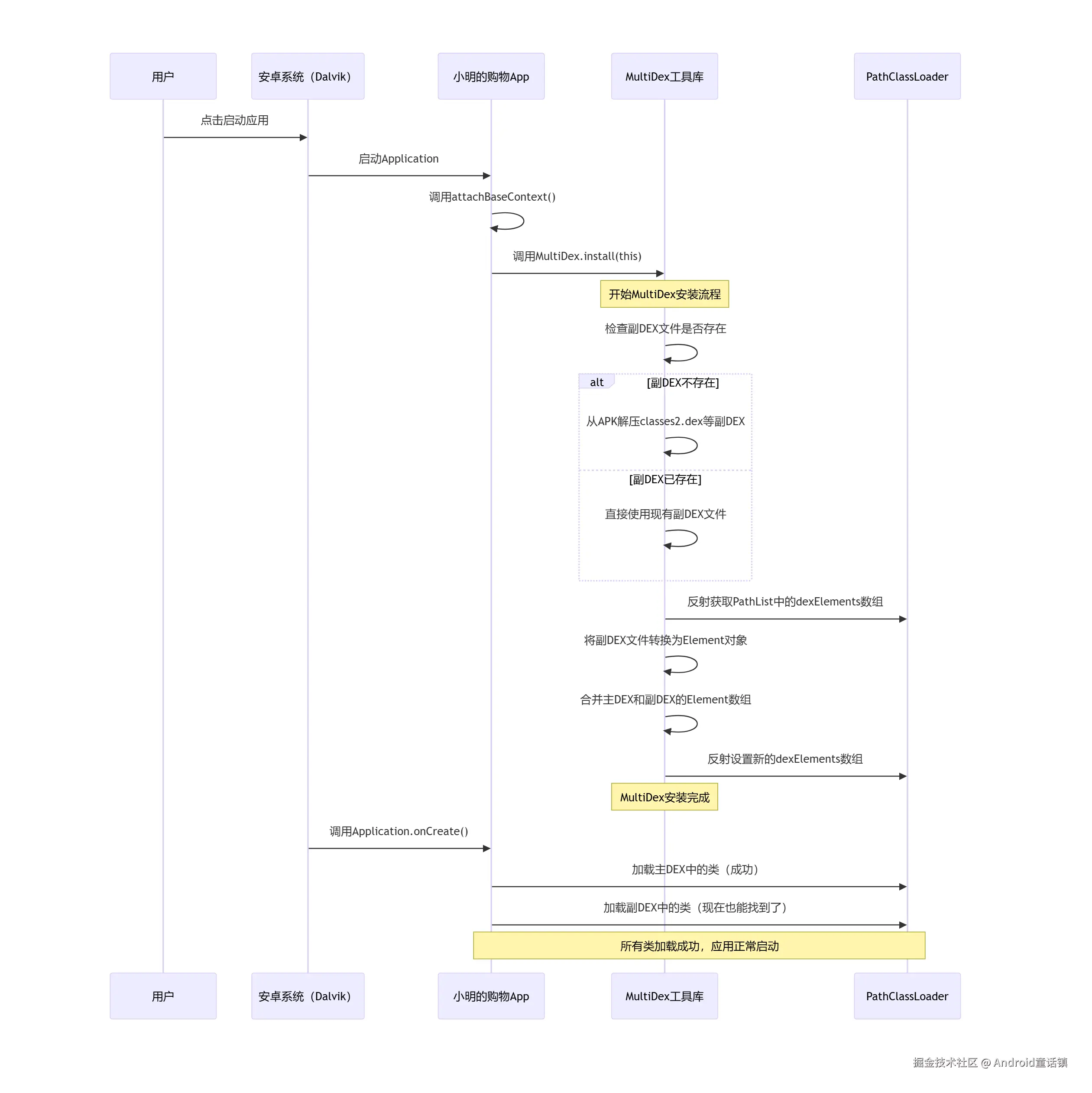 应用->>MultiDex库: 调用MultiDex.install(this)