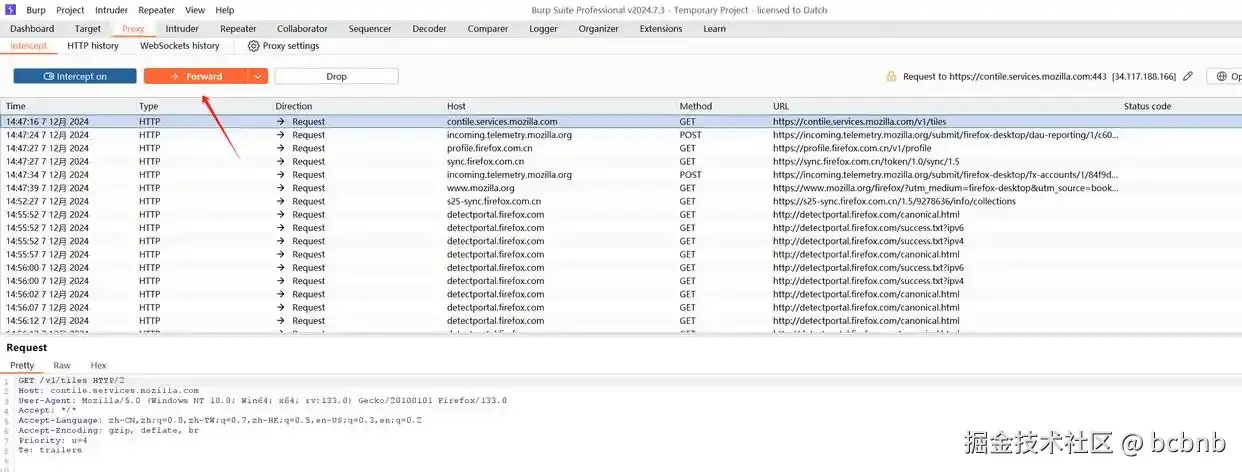因为在网页访问的过程中,一次请求往往包含不止一个数据包,这时候就可以使用Forward菜单,将数据包一个个放过,观察请求的响应。
