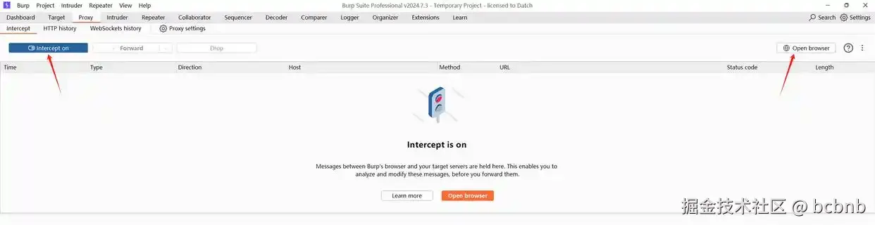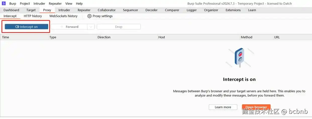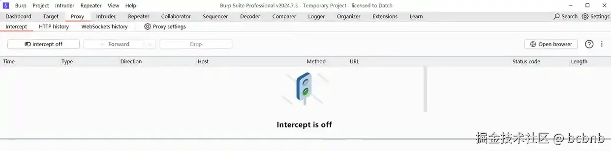Intercept on代表拦截开启,在浏览器开启代理,切换到Intercept on就可以进行抓包了,Intercept off表示拦截关闭。