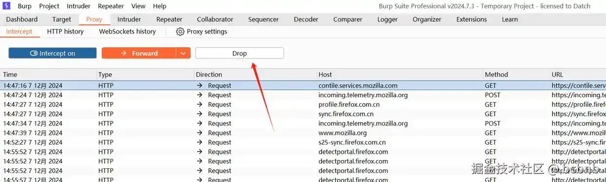 丢弃数据包,选择Drop,该数据包不会被发送到服务端,主要用于观察缺少某些数据后的响应。
