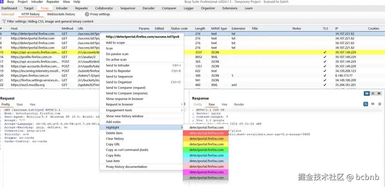 记录拦截数据包的历史记录,可以用不同颜色标记重要的数据包