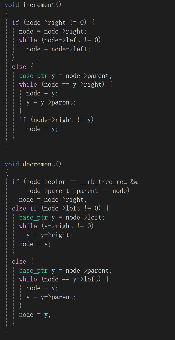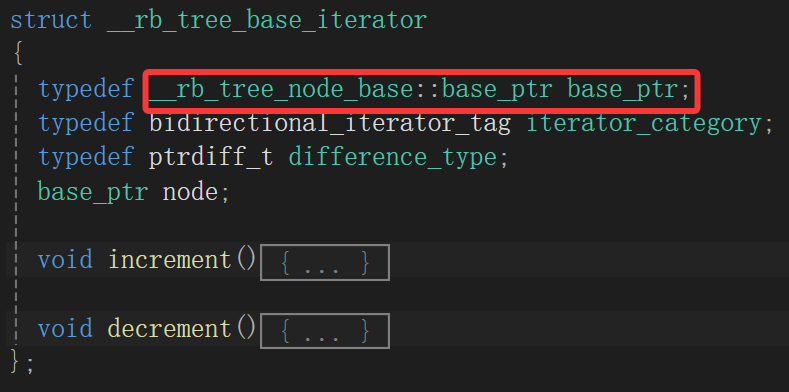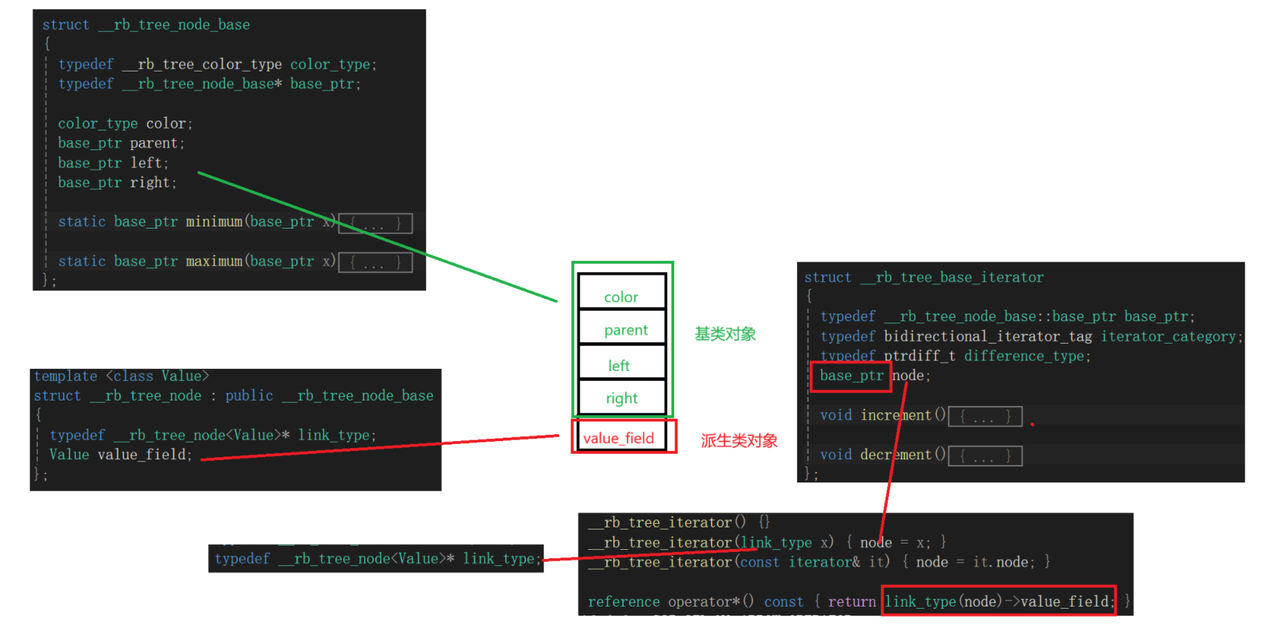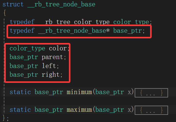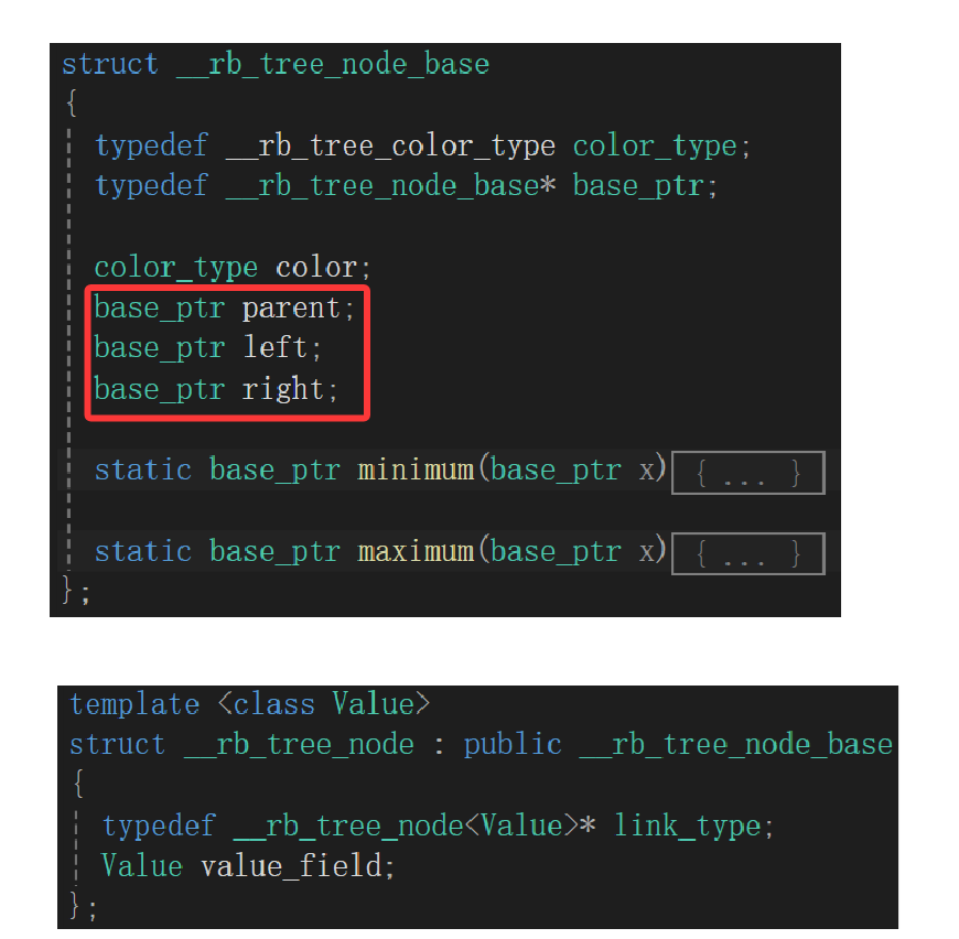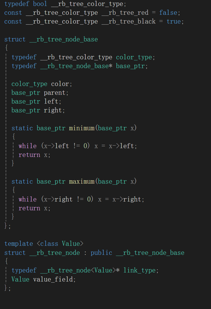 接着就看见了个struct tree_node_base,但是其实我看的时候没意识到看的是基类,看了看大概也就是红黑树结点的样子,有颜色、左右孩子和父亲指针,但是没有存储的值,我就继续往下看。