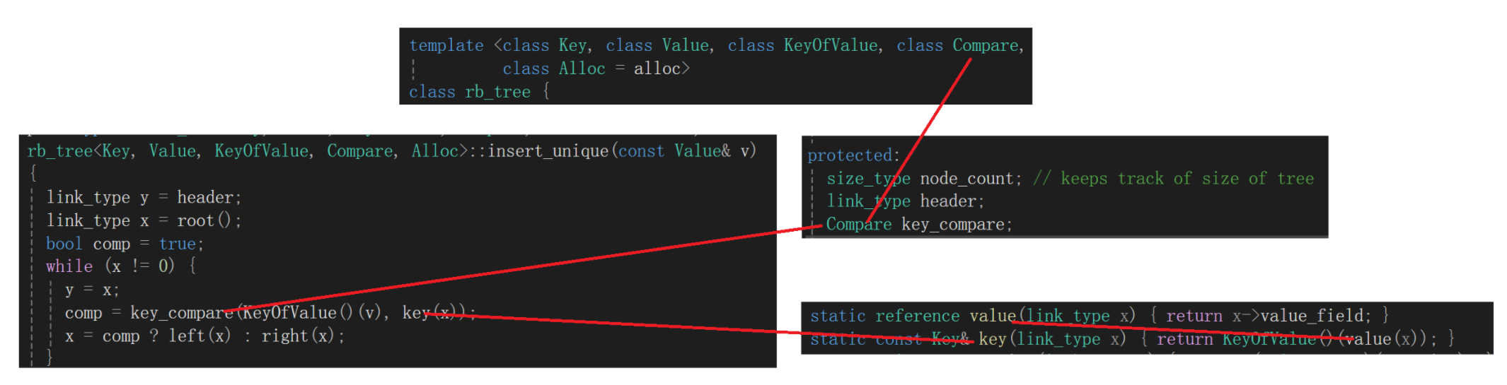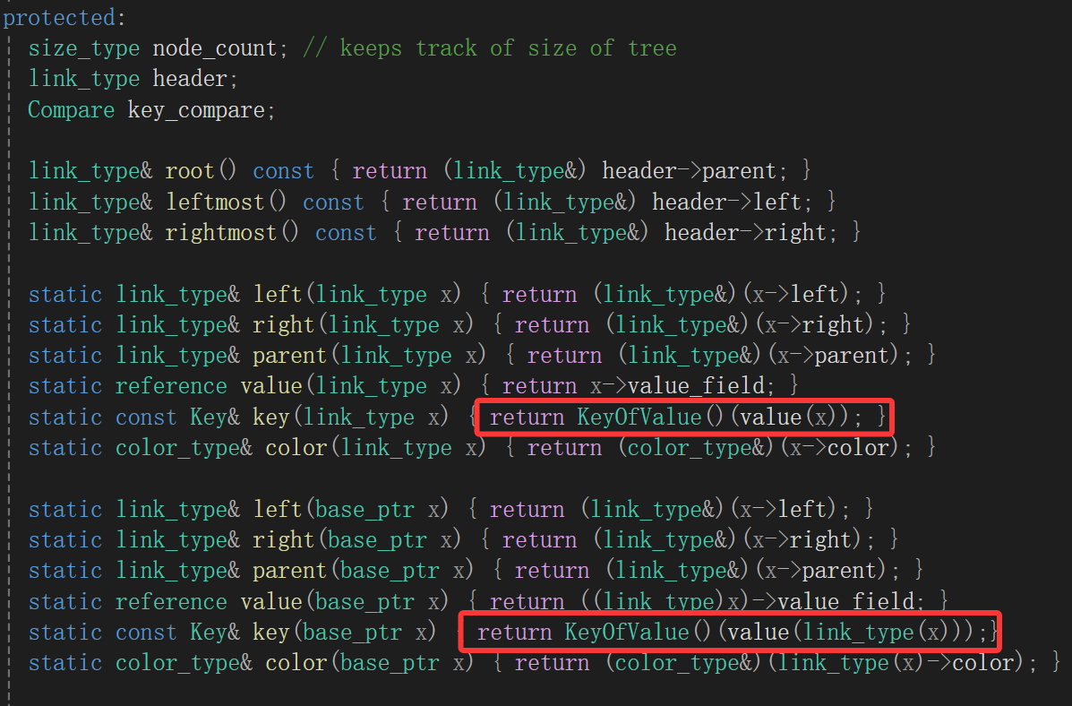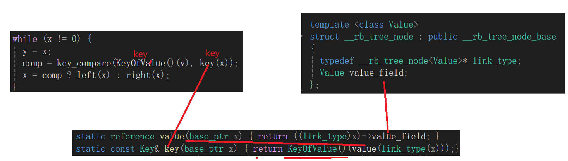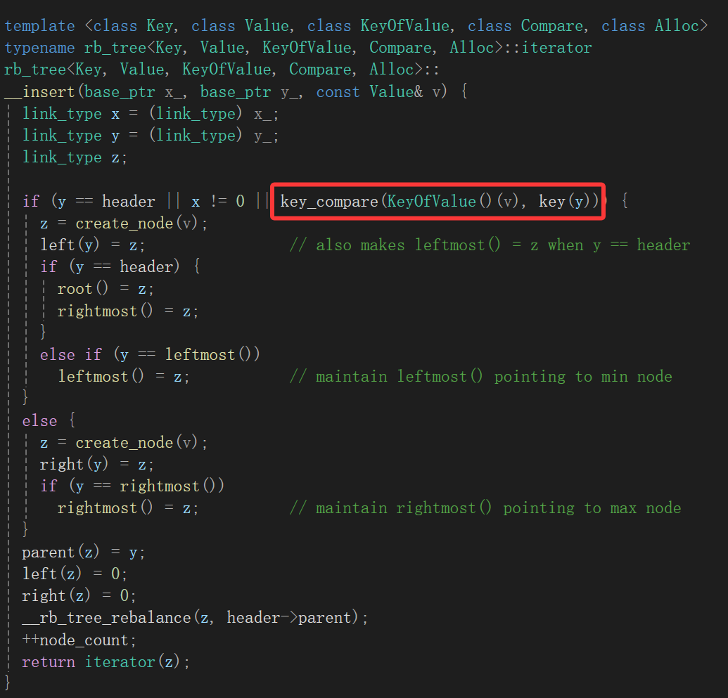 看到这里我就知道这个keyofvalue干啥的了,啥叫key_compare,不就是传过来的比较大小的仿函数类型有名对象的opeartor(),红黑树的比较大小不就是key跟key比,新插入的v的key跟当前遍历到的x的key比较,熟悉不熟悉这个操作,搞这么麻烦其实还是那套逻辑。