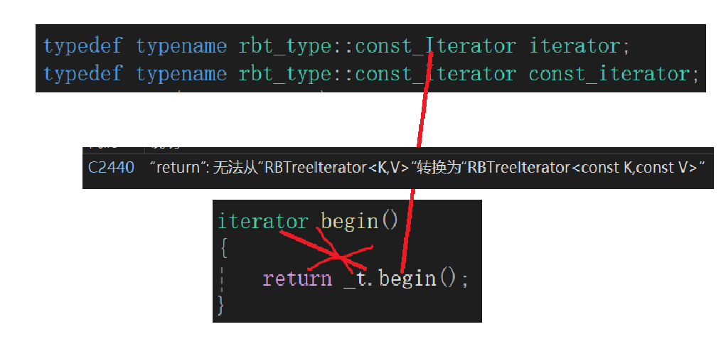 底层肯定调的非const_Iterator的接口,到这你又让它变成const_Iterator,没办法转换,所以这里我们直接这么设计: