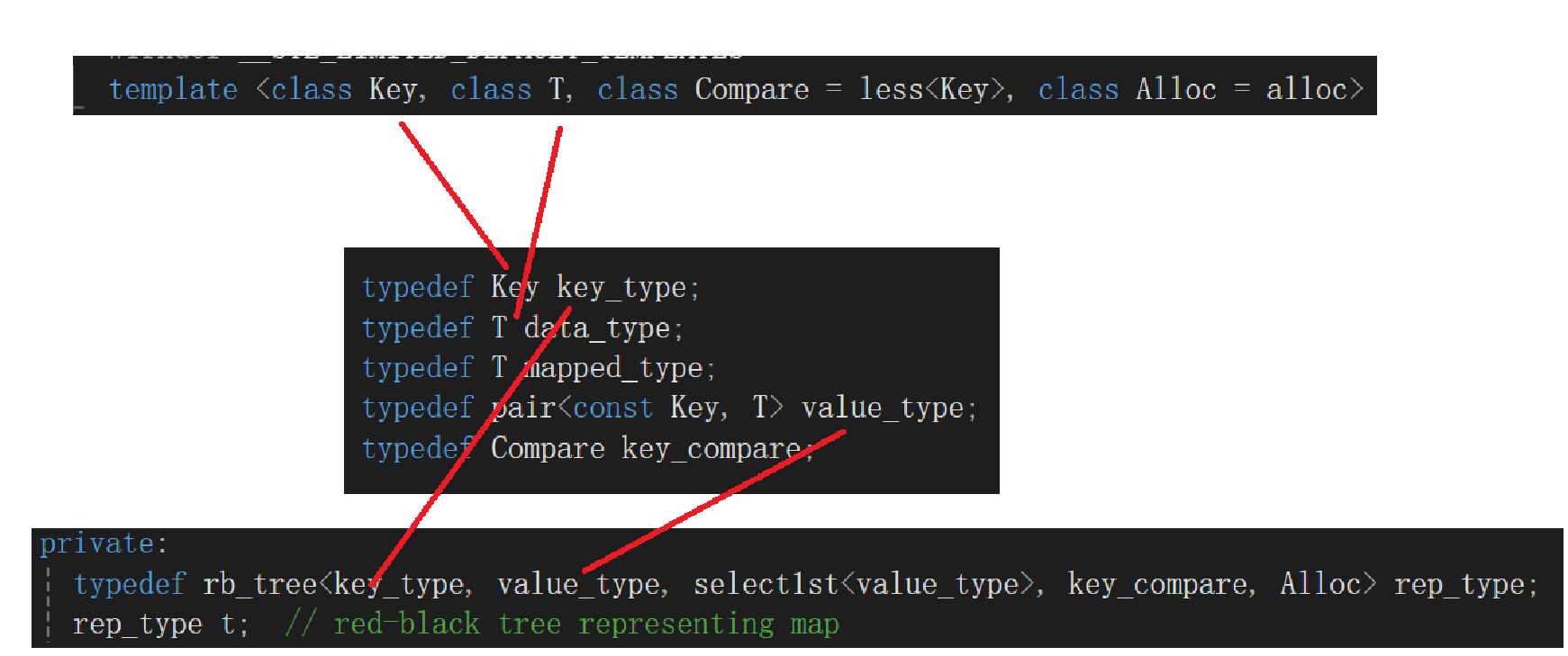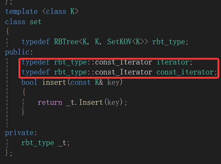 由这个图可以看出来,set底层红黑树结点存储的是key,map底层红黑树结点存储的是pair<key,value>,等于红黑树结点其实还是我们学过的红黑树的实现方式,但是其实担心红黑树结点存储值问题是解决了,不过为啥还要传这里的第一个模板参数key呢?