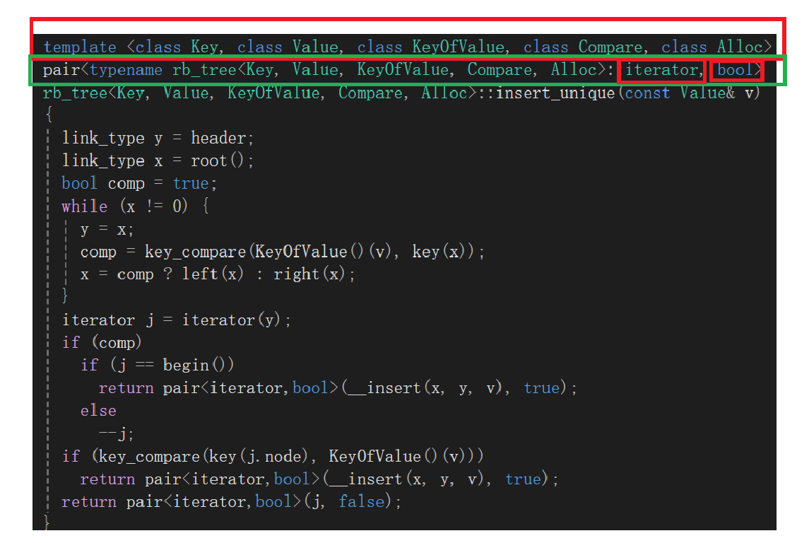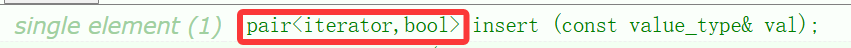 第二行其实我真吓死了,但是吧,重点就是它弄了个作用域限定符::前面跟的rb_tree这个类名,落脚到iterator了,后面是个bool,这个不就是我们学习使用的时候insert接口的标准返回值嘛,就算不记得了,我现在给你拉过来: