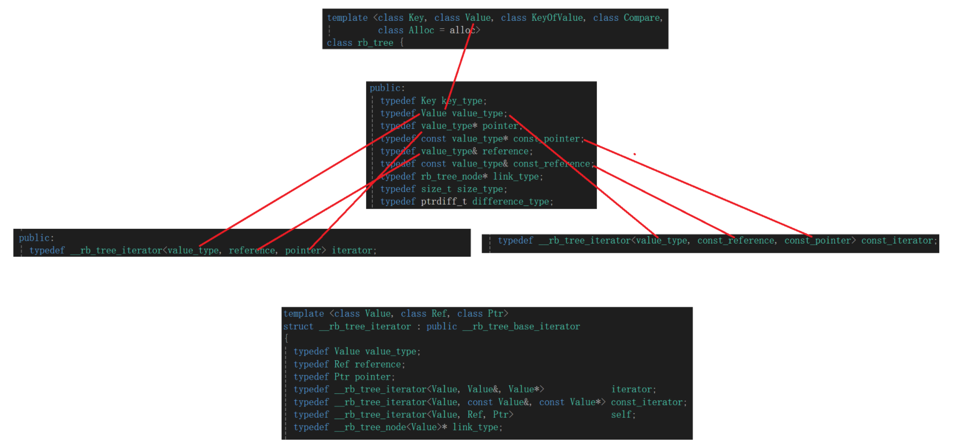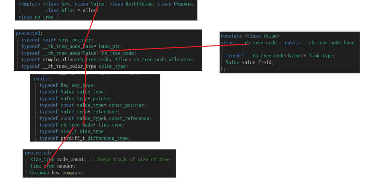这个tree_node类是个模板类,模板参数只有一个,value,大概猜测昂,其实就是上面实例化参数给的那个value_type,不然结点存啥,但是猜归猜,还是看看红黑树到底咋定义的: