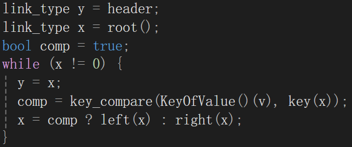 最关键的就是这,真是抽象死了,给我看傻了都,y初始是头结点,x弄了个root(),那真都不是猜了,一个红黑树能用root的是啥,所以进入循环前y是头结点,x是二叉树的根结点。