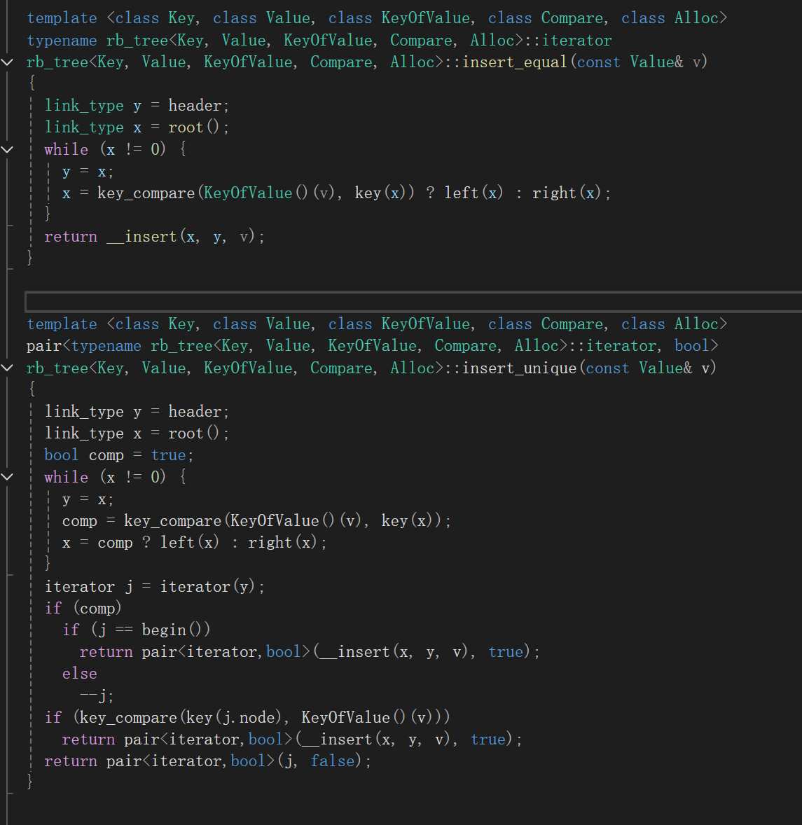 这俩函数都调了,看了看名字,一个叫equal一个叫unique,大概我猜昂,上面那个是用于插入相同数据,下面那个插入不同数据。因为我们学的set和map不是不允许冗余key的存在,multi版本的允许嘛,我们只实现普通的,所以就看那个unique版本吧。