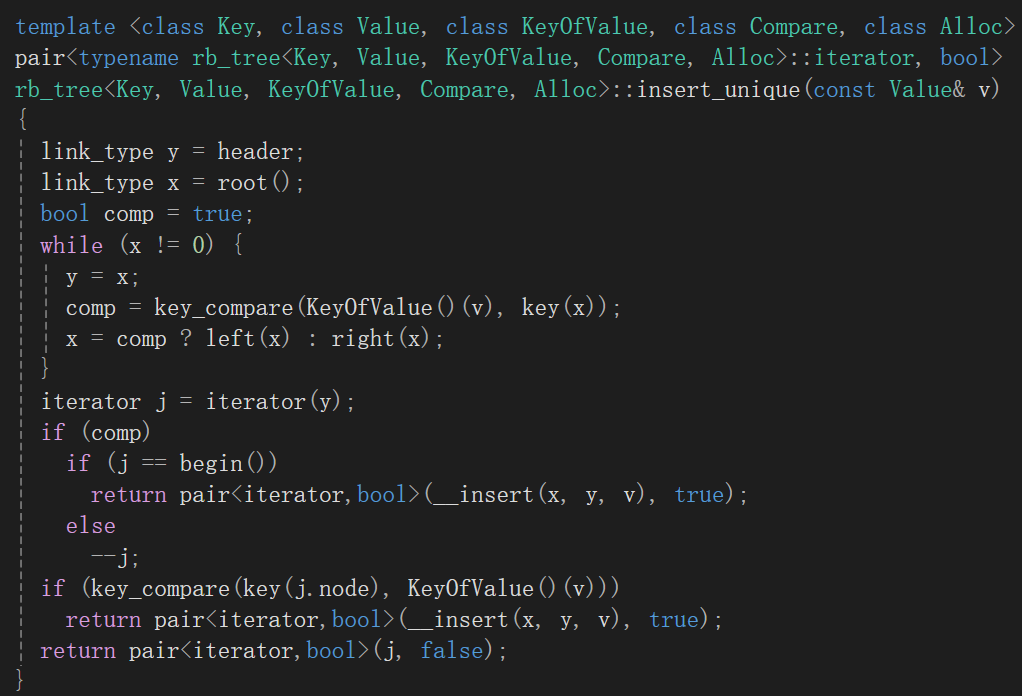 但是该说不说昂,看源码真是个体力活,我这轻飘飘的说最后线索找到了insert,硬是看了三四百行才看到这,而且还是基于我对C++语法的发展(NULL和nullptr),以及红黑树insert底层逻辑的理解才弄懂。