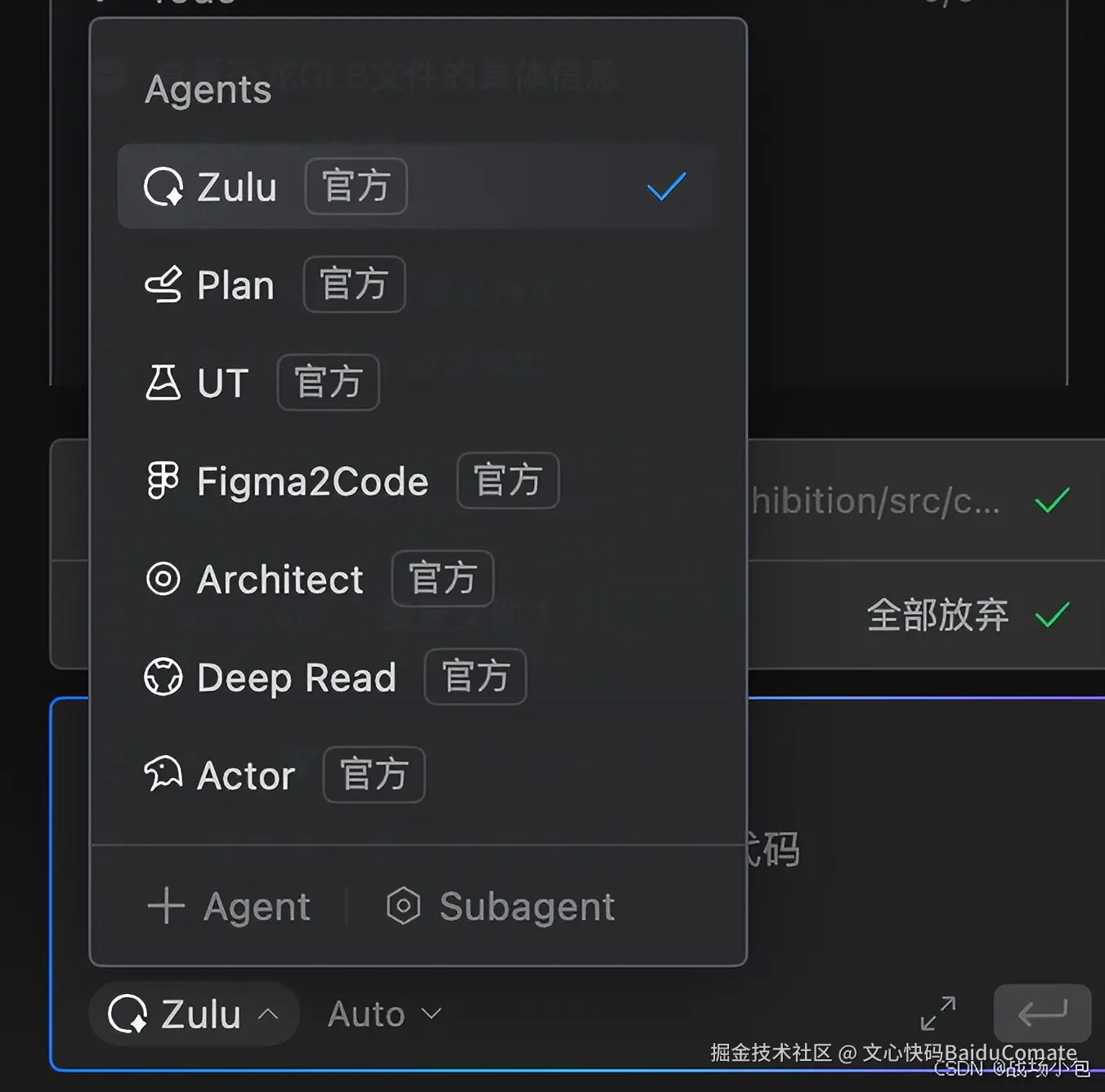 先插入几句,使用的时候,发现文心快码 3.5S提供了多种Agent,小包去稍微查了一下,大致如下: