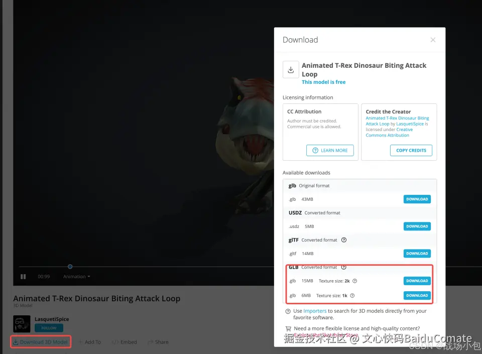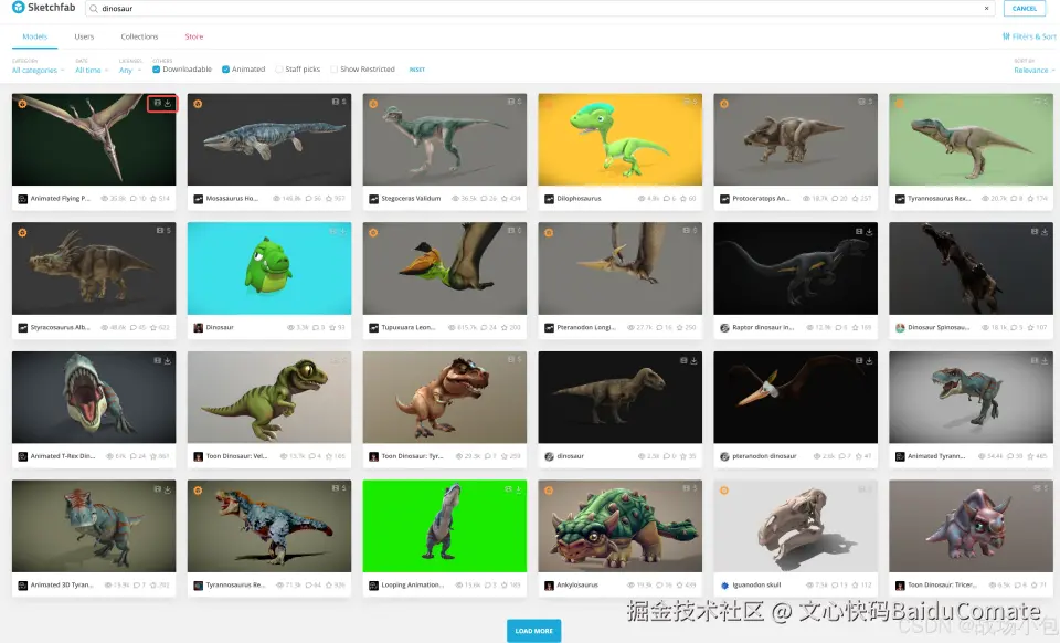 在实现一个恐龙乐园之前,首先需要一些准备工作。这里比较推荐 sketchfab,从里面下载一下,恐龙的模型非常多,porsche_taycan 模型相对少一些,而且不够精美。注意红框处,代表内置动画和支持免费下载。