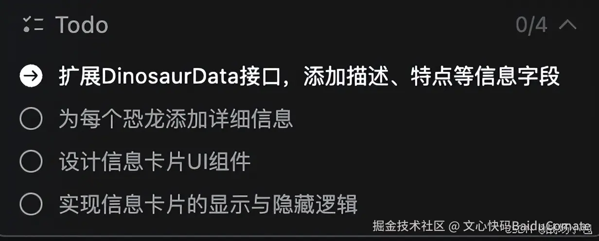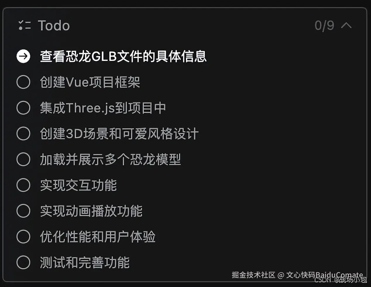 文心快码3.5S会首先规划要做的事,将上面笼统且复杂的任务拆解成9个清晰的todo,看到这里,小包心中大定。