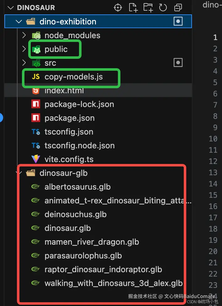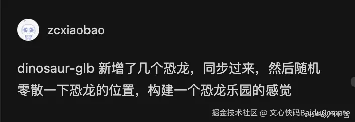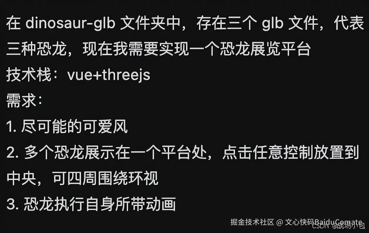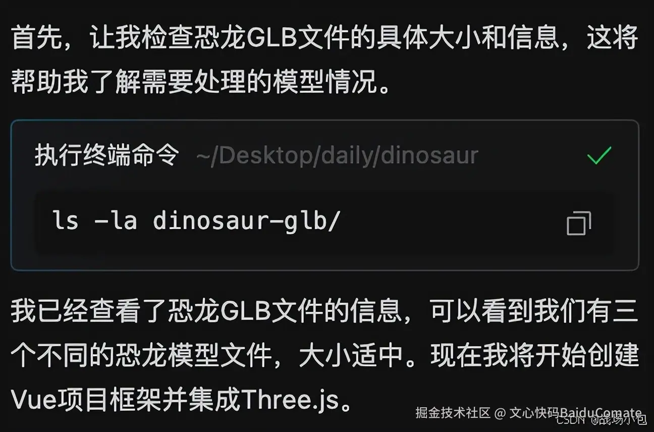 比想象中快很多,大约等了5-6分钟,运行项目,竟然一次成功啦! 预想是三次交互能成功就非常不错了,结果也令人惊喜,而且还做了一些舒适的细节处理 ,比如展示台和空中的移动云朵效果等。文心快码3.5S,首先检查了dinosaur-glb文件夹下模型的大小和信息,并编写脚本将模型同步到了public/assets中: