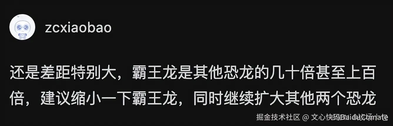 由于一直改正不成功,怀疑是不是有一些基础性问题,由此去重新看了一下模型效果,发现大的是迅猛龙(被蠢哭),我倒啊。修改描述,重新询问,得到阶段性效果如下: