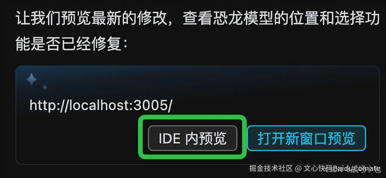 这时候发现文心快码3.5S一个超强的功能 ,爱了。文心快码 3.5S 提供 IDE 內预览的能力,正如你所想,就是在IDE中打开网页,进行预览。嗨,那这有什么稀奇的?