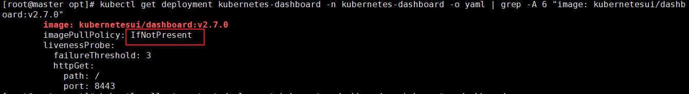 [root@master opt]# kubectl get deployment kubernetes-dashboard -n kubernetes-dashboard -o yaml | grep -A 6 "image: kubernetesui/dashboard:v2.7.0"