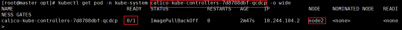 calico-kube-controllers-7d8788dbf-qcdcp 0/1 ImagePullBackOff 0 2m47s 10.244.104.2 node2 <none> <none>