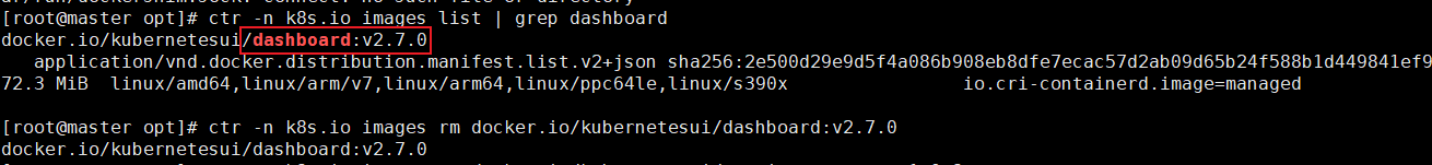 [root@node1 opt]# ctr -n k8s.io images rm docker.io/kubernetesui/dashboard:v2.7.0