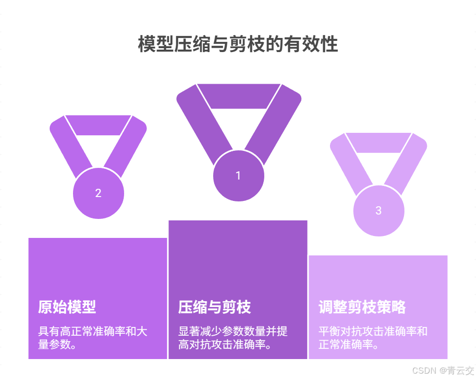 从表格中可以看出,经过压缩与剪枝后,模型的参数数量大幅减少,这意味着模型占用的存储空间和计算资源也相应减少。同时,对抗攻击准确率显著提高,说明模型对对抗攻击的抵抗力增强了。虽然正常准确率略有下降,但在实际应用中可以通过调整剪枝策略来平衡。