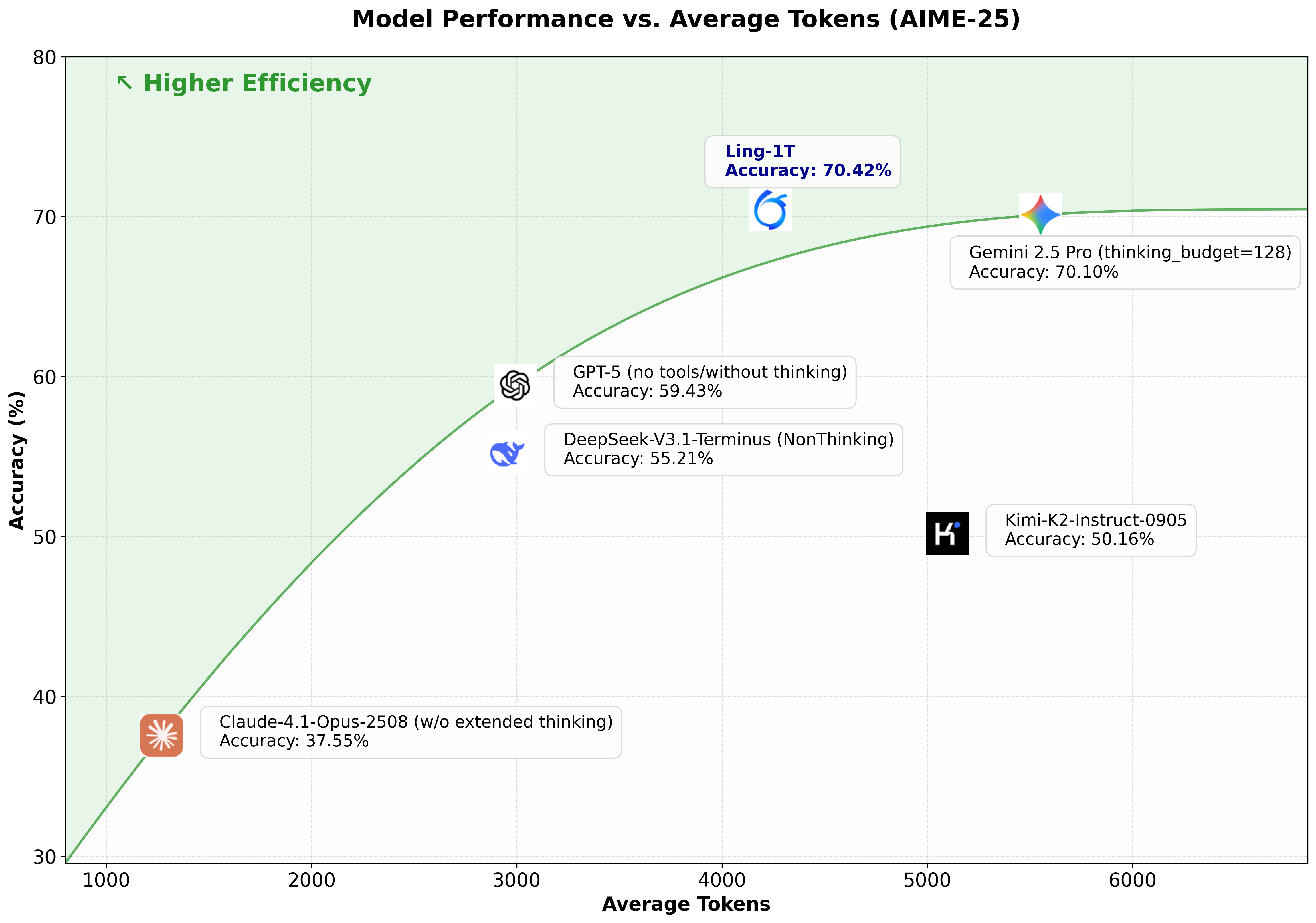 以下是 Ling 1T 的测试数据,测试数据显示 Ling 1T 使用 4000 token 就可以实现 70.42% 的正确率,但 Gemini 2.5 Pro 需要 5000 tokens 才能达到相近效果。