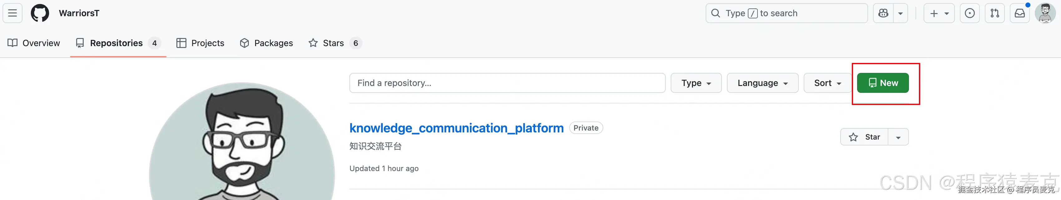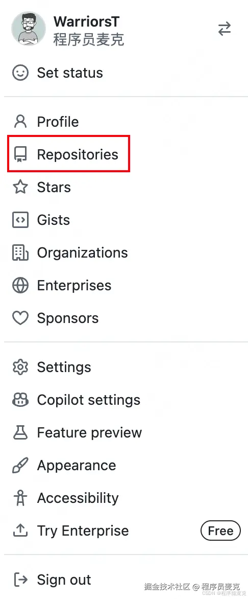 2、点击个人头像,再点击Repositories