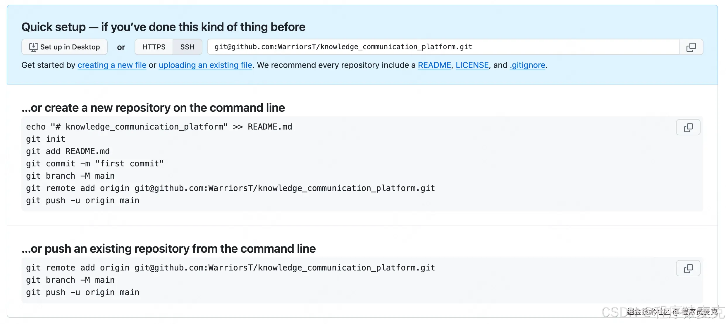 其实当你创建完本地仓库之后,点进仓库,GitHub已经给我们展示了操作说明,如图: 新人朋友估计很头疼,下面我来做个拆解,其实就三个步骤,当然此处你需要先创建好本地仓库。