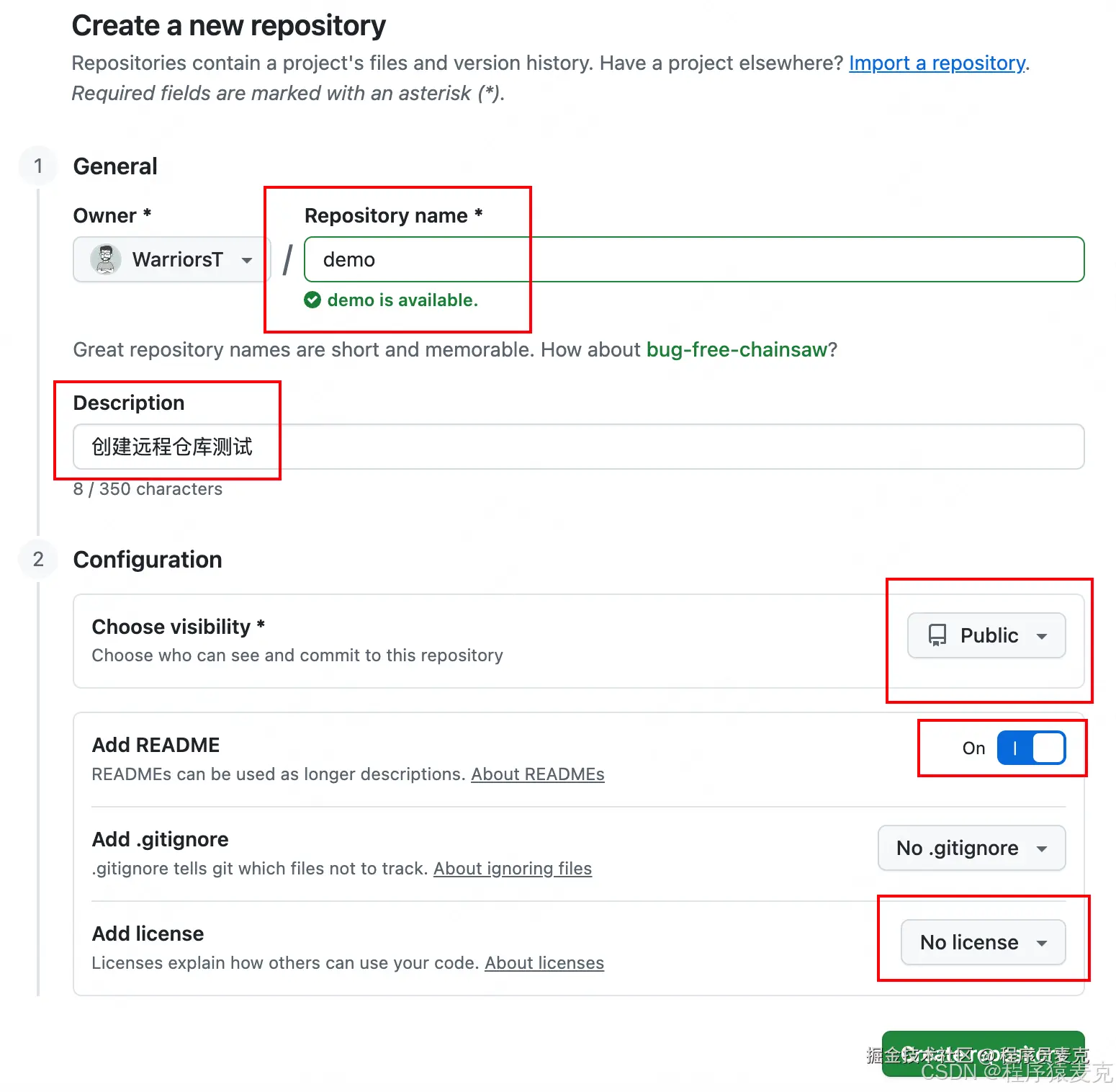 4、按要求填写仓库名称、描述、仓库可见性、license等等即可,关注我圈起来的位置。 这里简单说一下license是什么: