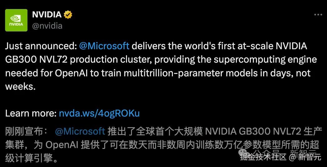 纳德拉官宣,全球首个配备 4600+ GB300 的超算率先上线,专攻 OpenAI。预计,未来将扩展到十万块 GPU。