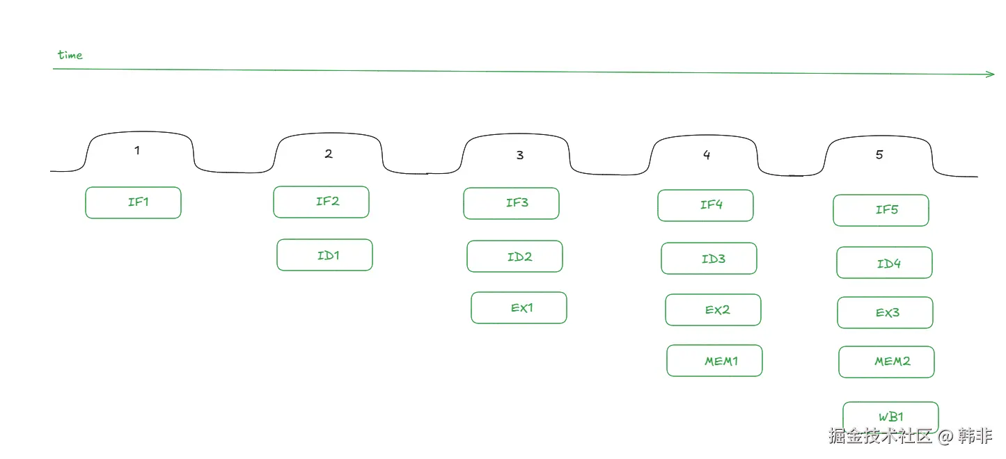 在上面的五个时钟周期过后,缓存中的第一条指令执行完成,第二条指令还差最后一个阶段,使用五阶段流水线执行指令的耗时如下: