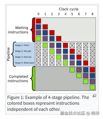 上图是一个4阶段流水线的执行示意图,其中红、蓝、紫、绿四个正方形表示的是一条指令,指令经过流水线从上向下执行,在指令等待区中就包括明确要执行的指令和CPU猜测可能需要执行的指令。