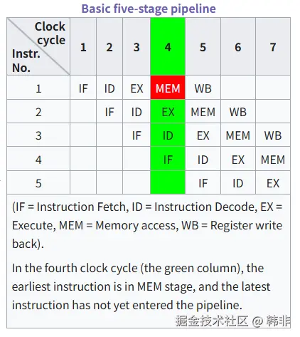 在计算机中,流水线的存在可以让单个的处理器并行的执行多层级的指令。如下,是一个基础的五阶段流水线示意图。