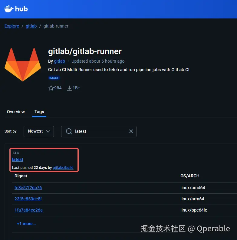 登录docker hub可以发现,当前gitlab-runner的latest版本应该是22天前发布