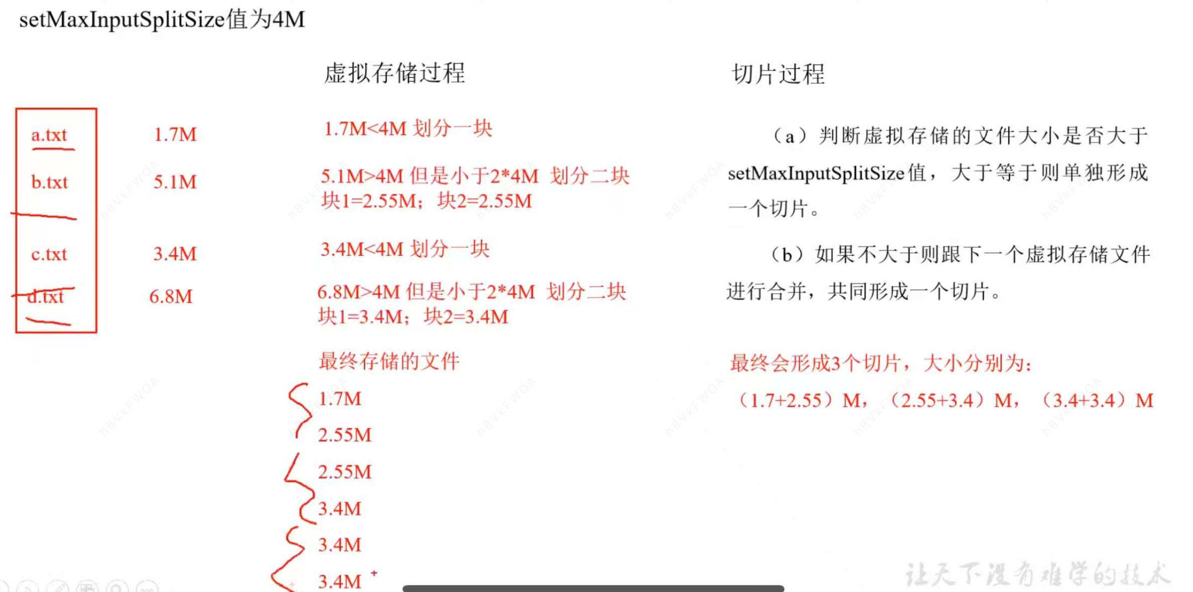 与TextInputFormat不同,CombineTextInputFormat生成切片的过程包括,虚拟存储过程和切片过程两部分。