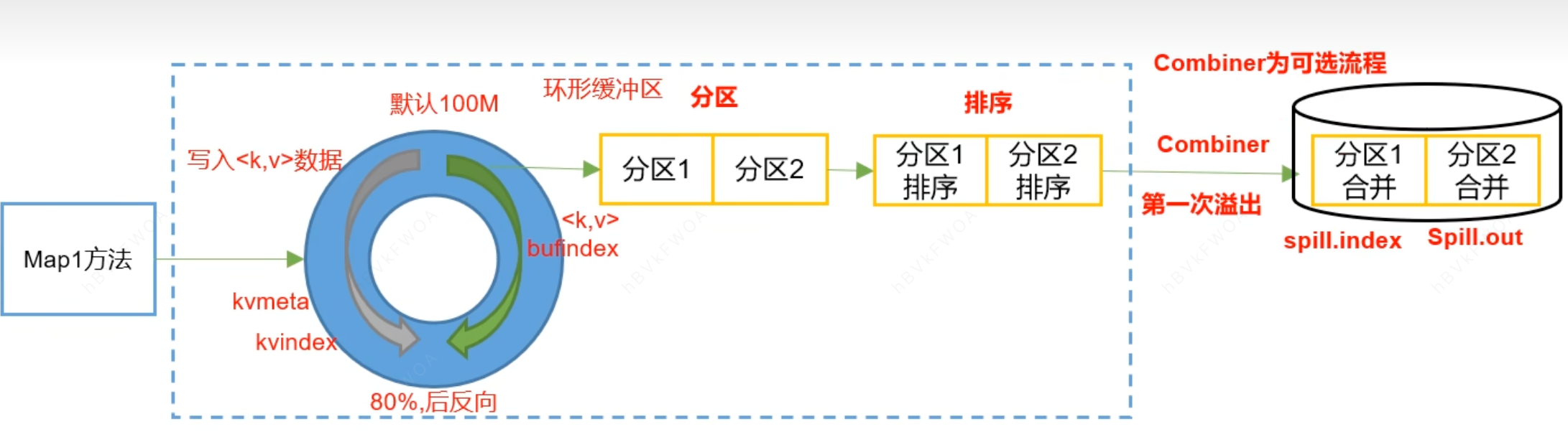 上面说过了,后台线程(也就是负责溢写的线程),会将满足阈值的环形缓冲区中的内容溢写到磁盘中,Combiner所负责的就是,在溢写前先做一次预聚合。因此可以理解为,如果设置了Combiner,那么就是在每一次溢写前都会涉及到一次Combiner预聚合。