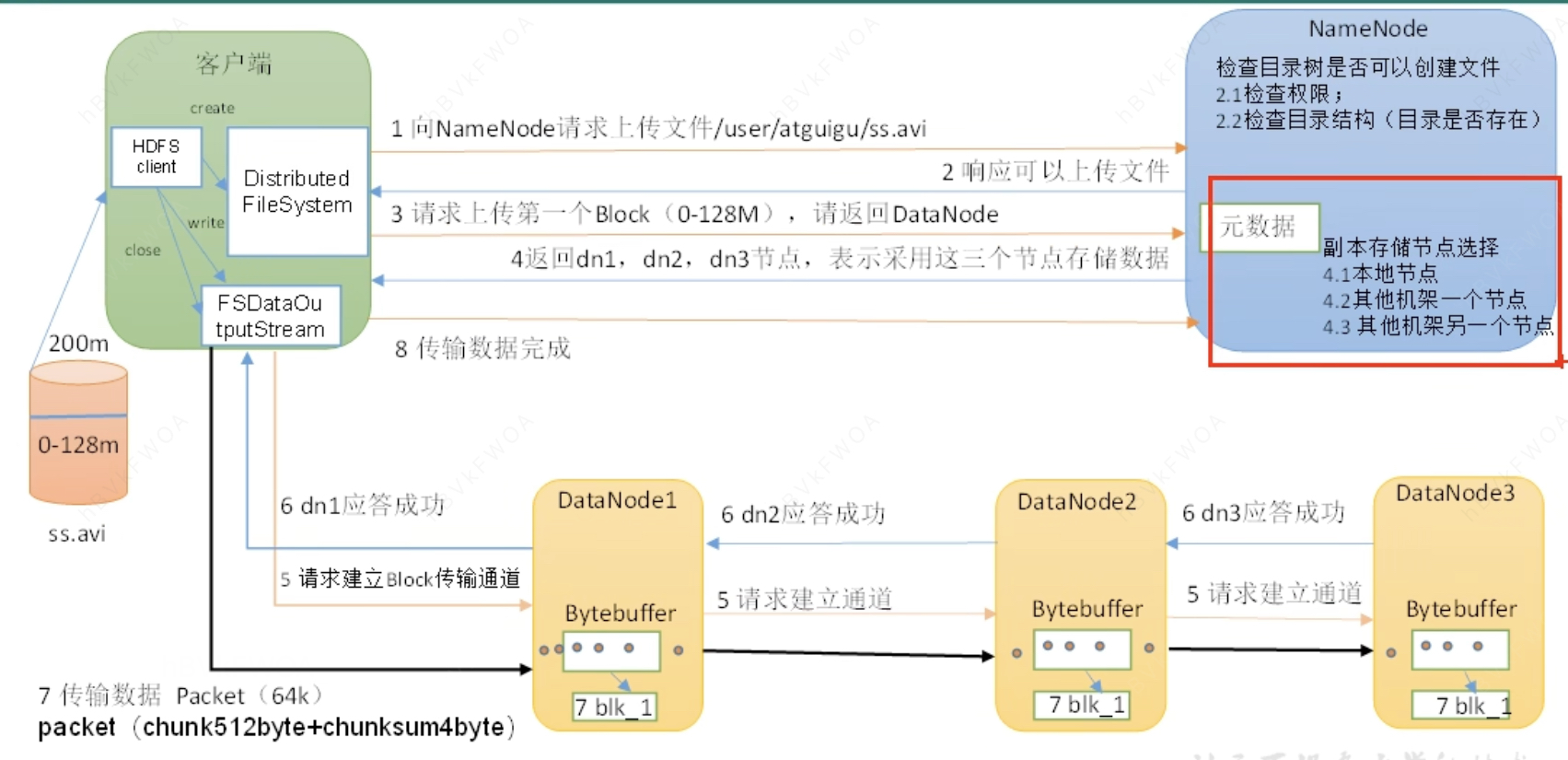 5.HDFS Client:那我开始建立Block传输管道了哈,这时候我创建FSDataOutputStream,首先我创建这个FSDataOutputStream这个流的时候,我是一个一个Chunk先准备好,然后再由Chunk组成Packet,组成Packet之后,开始往DataNode1传输。