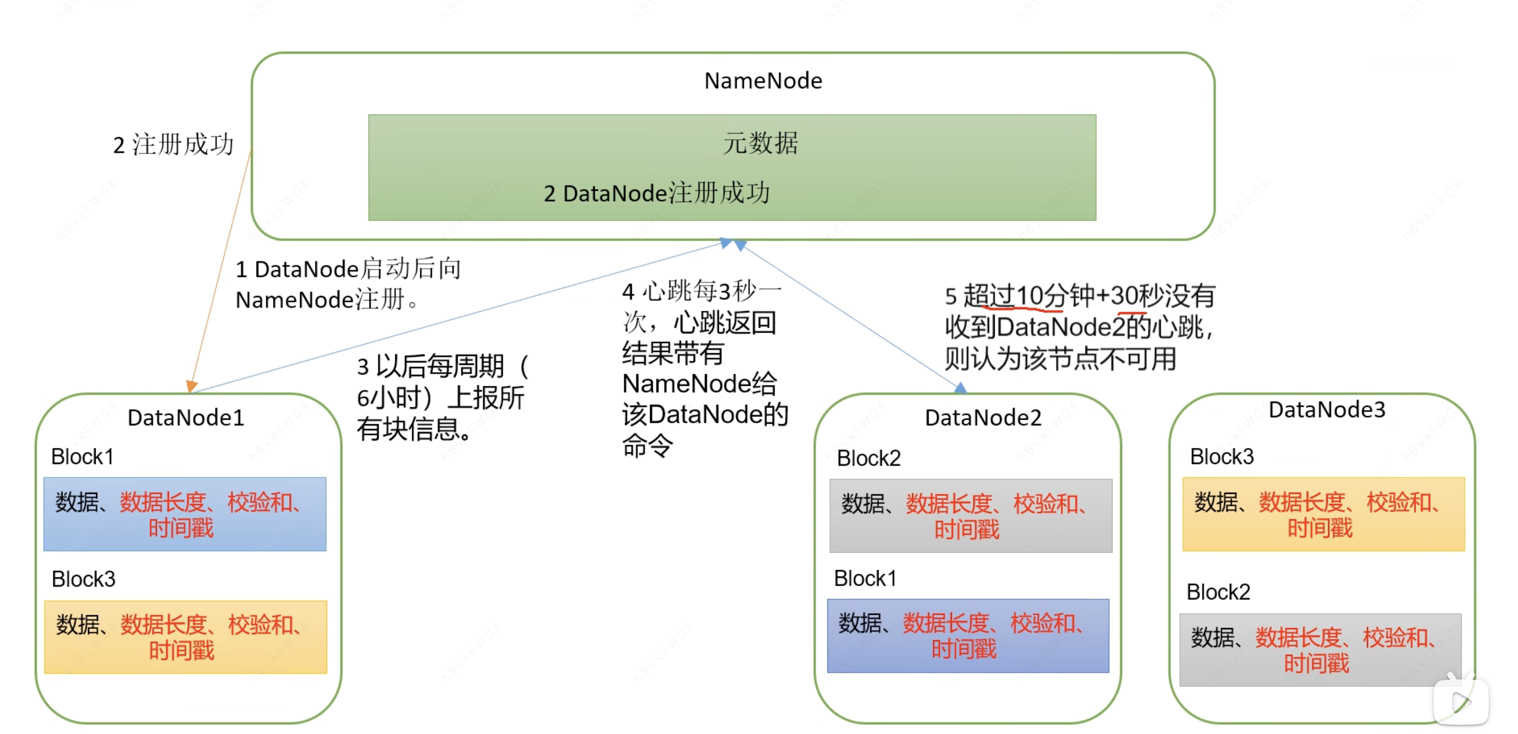 2.心跳测试:每周期(一般是3秒)会向NameNode返回带有NameNode给自己的命令,通知NameNode自己处于正常工作的状态。如果NameNode超过10分钟+30秒没有收到DataNode的心跳,则认为该节点不可用了。
