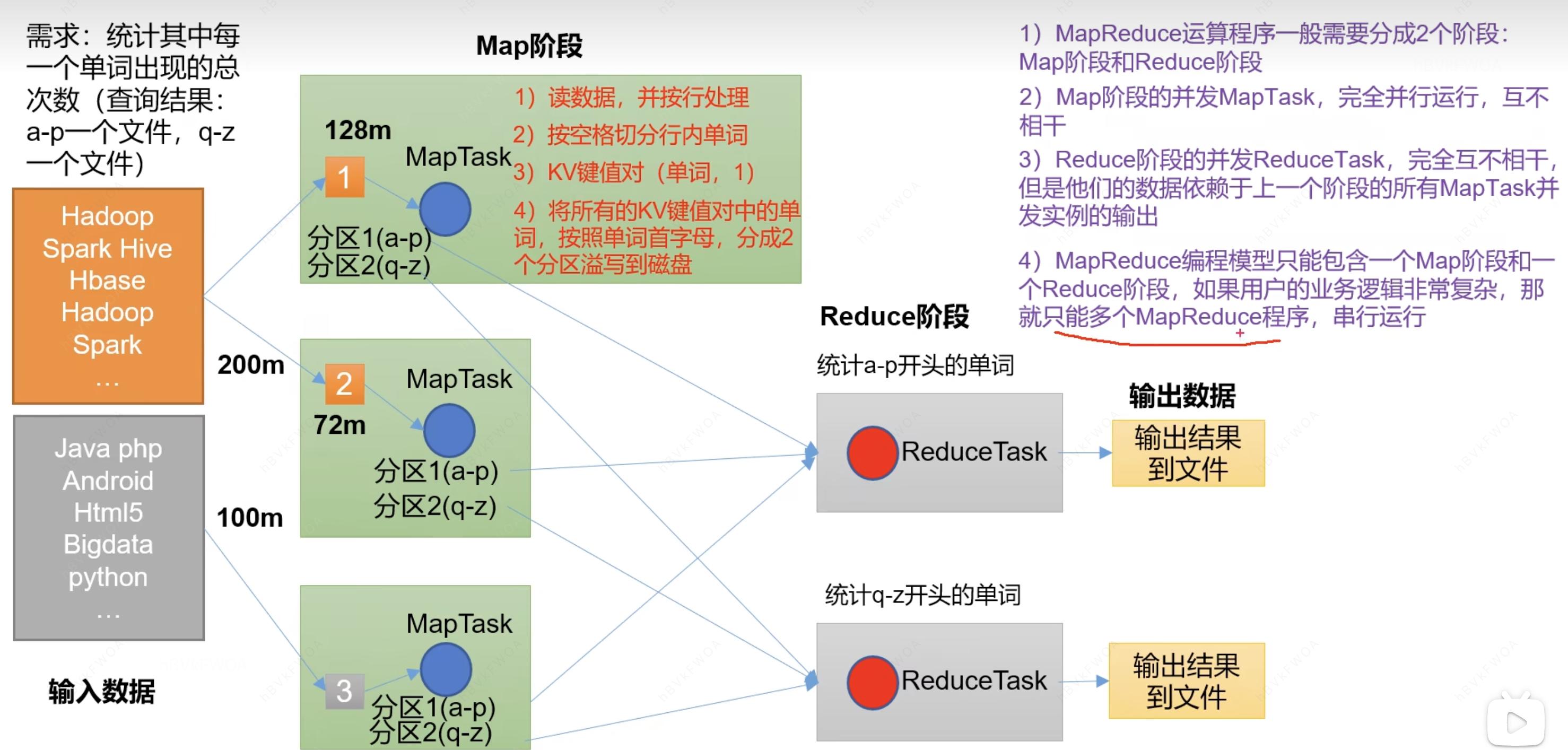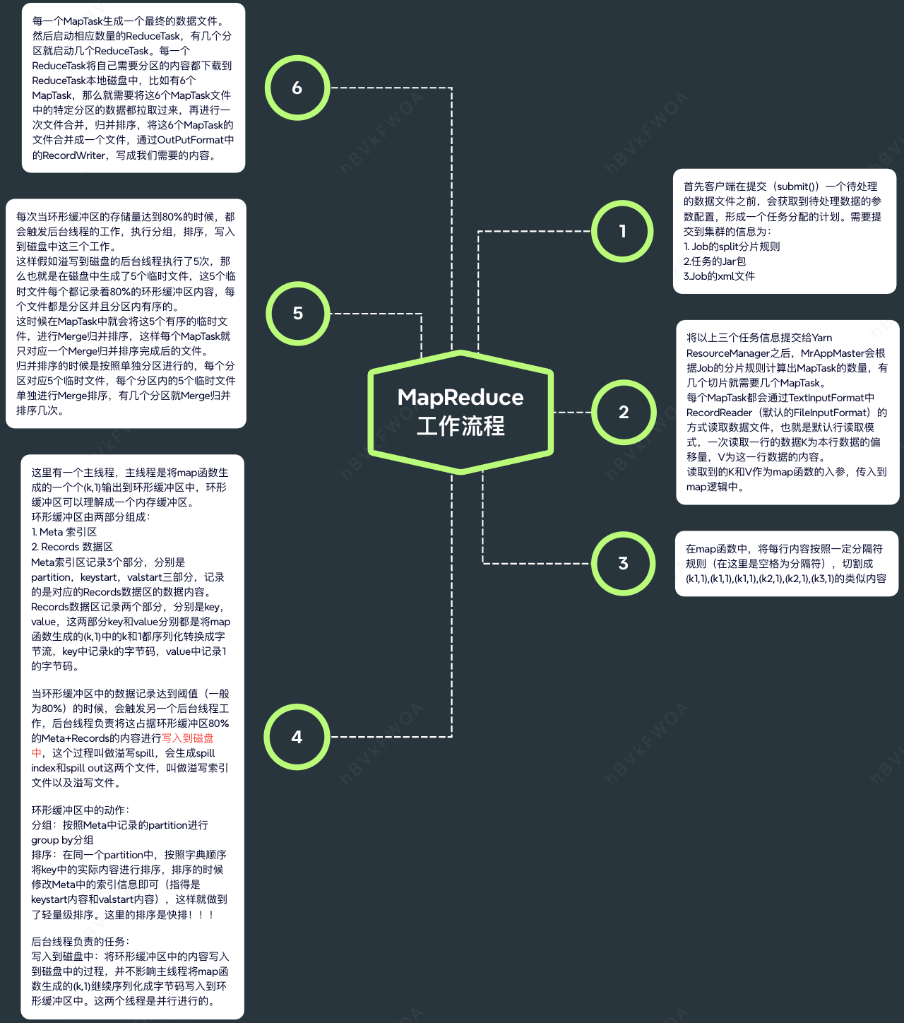 其中思维导图中的1-5为MapTask的过程,6为ReduceTask的过程。注:一般情况下是所有MapTask的流程都执行完了之后,ReduceTask才会开始工作。(Reduce也是从磁盘上去拉取数据的)