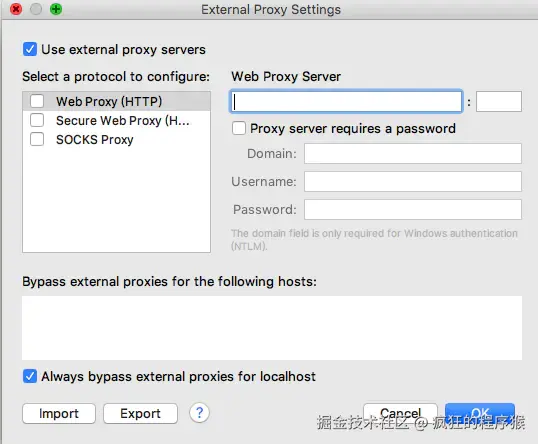 很幸运的是,Charles提供了嵌套代理的功能,在Charles里面它被称为外部代理(External Proxy)。设置入口是在菜单上的Proxy------External Proxy Settings。勾选下图中的Web Proxy,设置Web Proxy Server为127.0.0.1,端口设置为weinre的代理端口,如此操作之后,weinre代理就成了Charles的外部代理,weinre远程调试与Charles映射兼得,经测试,非常成功!