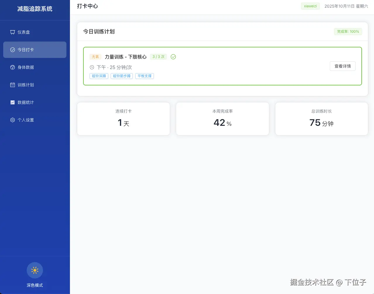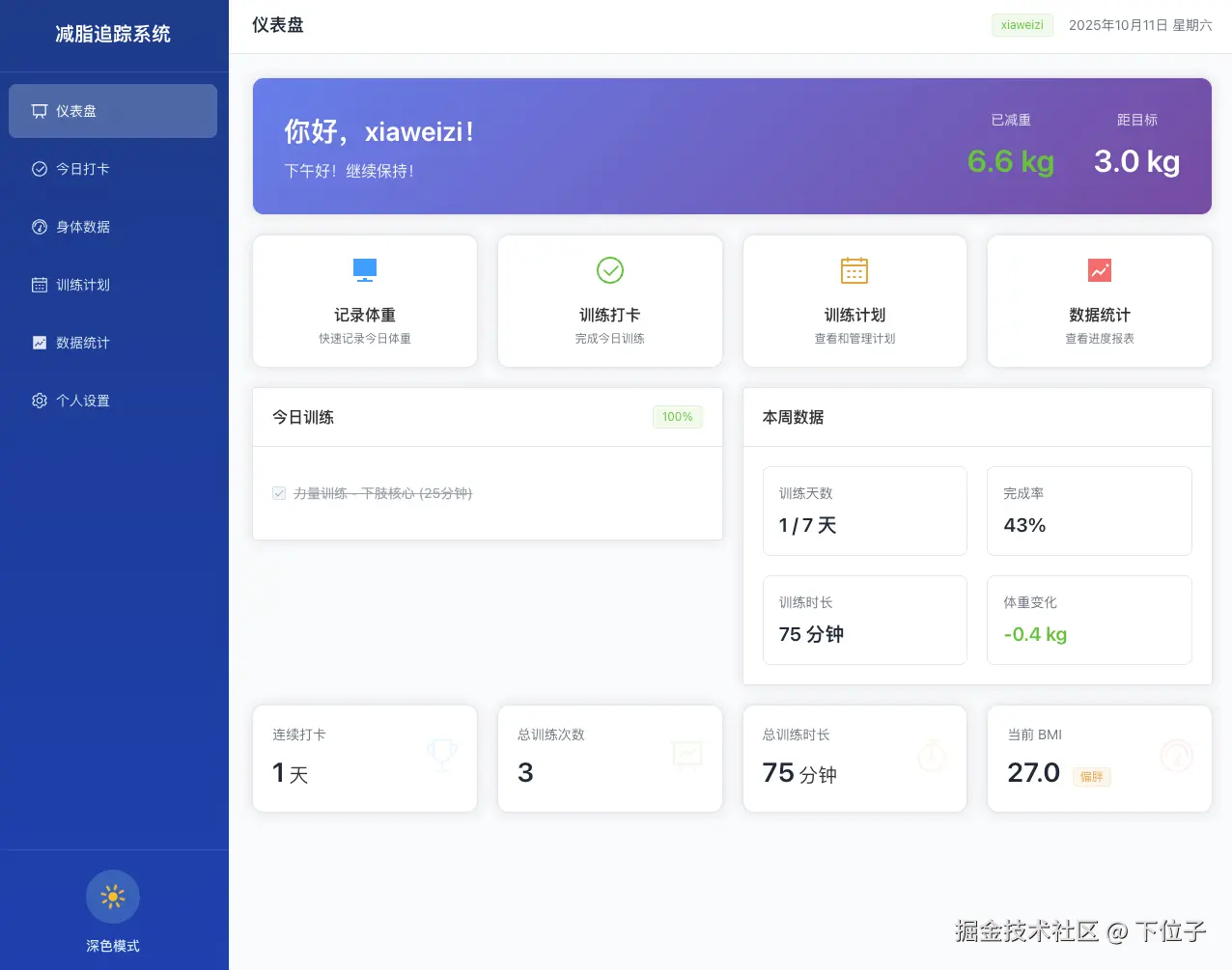 作为一个程序员,长期久坐让我意识到健康管理的重要性。想要科学减脂,但市面上的健身 App 要么功能臃肿,要么需要联网注册,数据隐私得不到保障。于是萌生了自己开发一个纯前端、离线可用、数据完全本地存储的减脂追踪工具的想法。