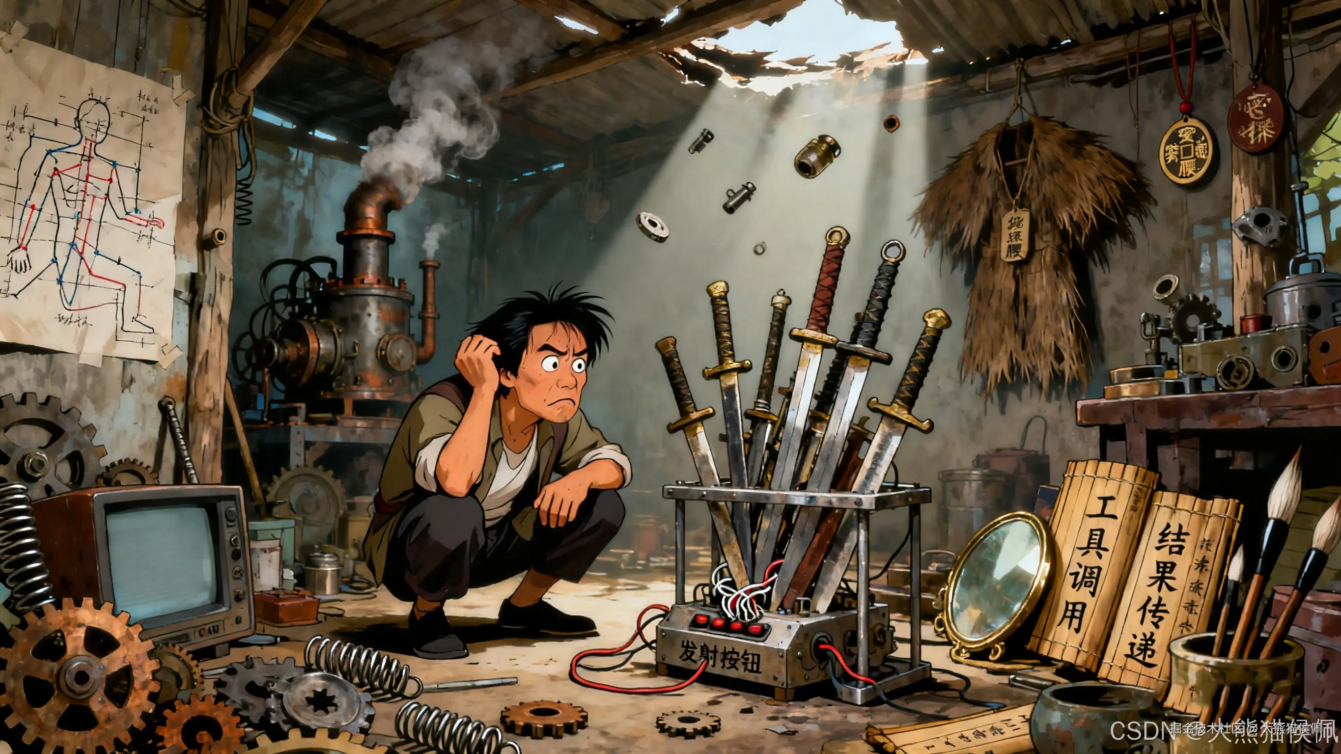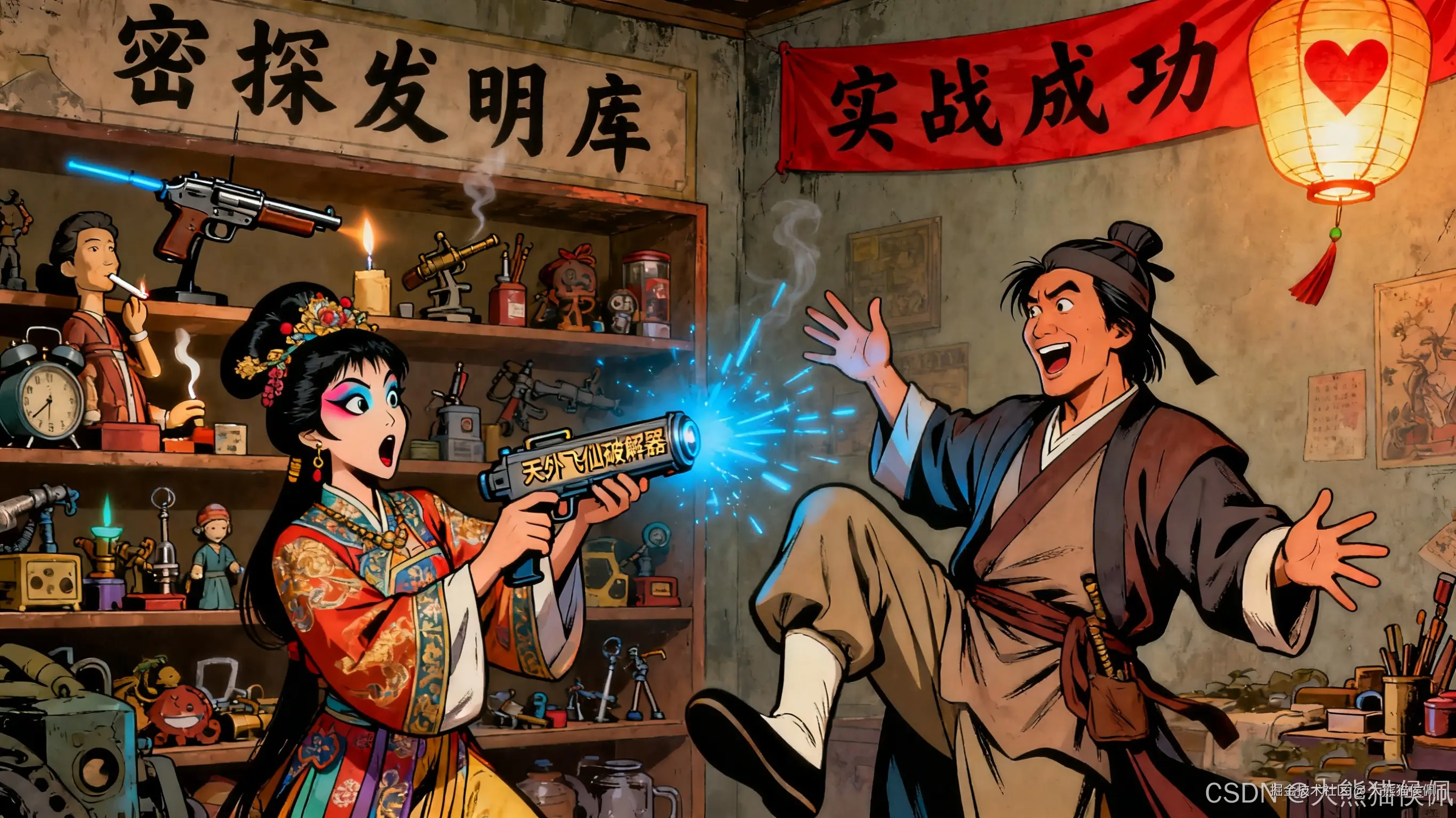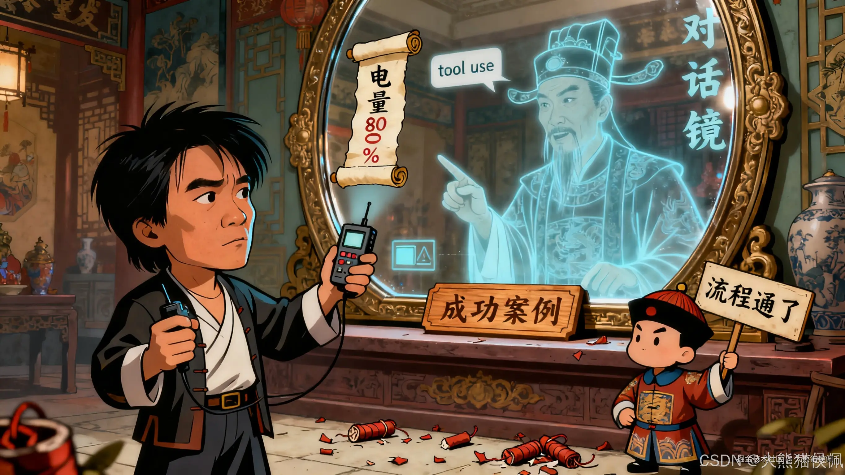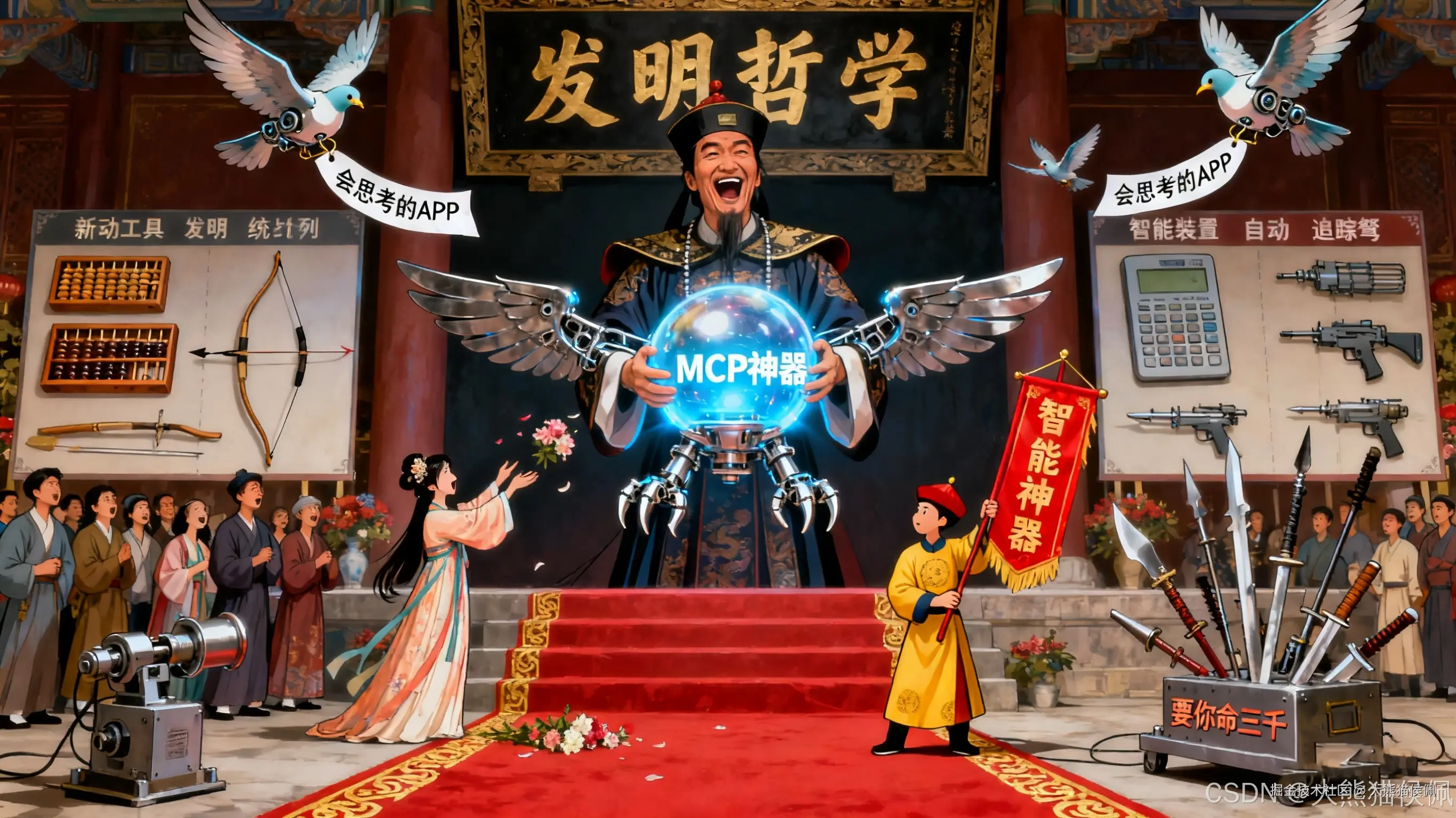 他拿起 "天外飞仙破解器" 比划着:"这就像我当年发明武器,不光要能打,还得会'思考'------ 敌人来了,它自动选刀还是选枪。做 APP 也一样,光有界面不够,得让它懂用户、会办事,这才是'智能'的真谛啊!"
