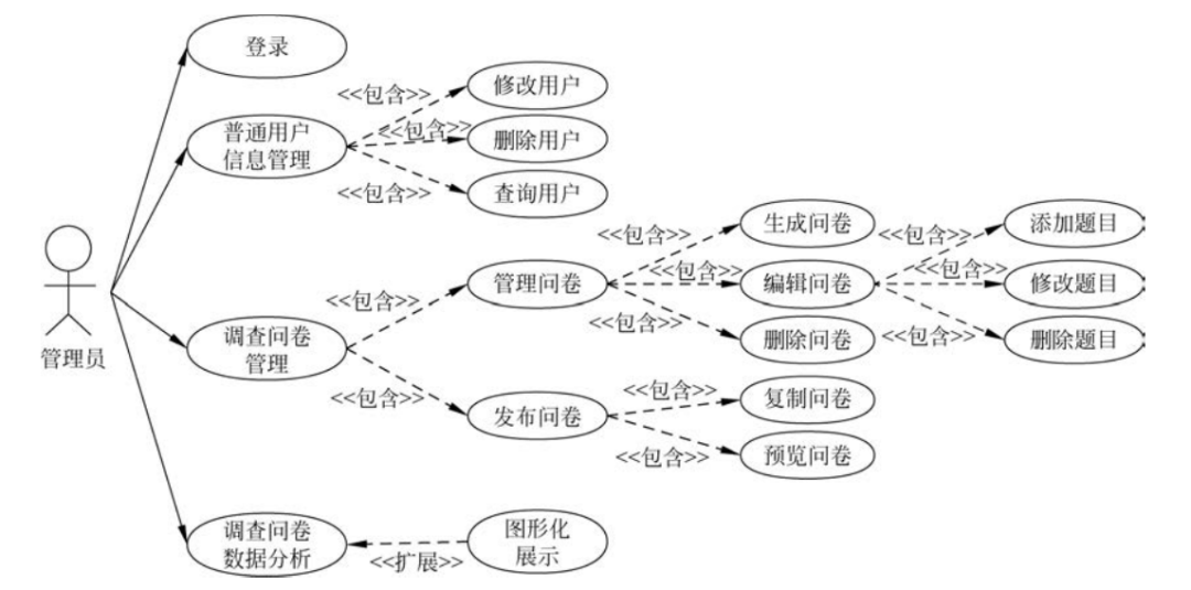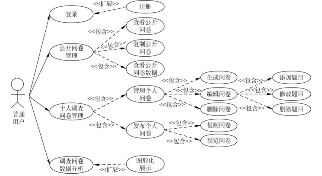 调查问卷管理系统主要用于调查问卷的管理、发布、使用、数据收集及统计等,同时需要对用户和管理员的信息和权限进行管理。系统分为管理员和普通用户两类角色。管理员的功能包括: 登录、普通用户信息管理、调查问卷管理、问卷数据分析等。普通用户的功能包括: 注册、登录、个人调查问卷管理、个人调查问卷数据管理、公开问卷、问卷数据分析等。