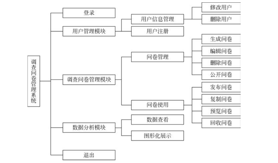 调查问卷管理系统的功能模块主要分为登录、用户管理模块、调查问卷管理模块、数据分析模块及退出模块。用户管理模块是用户信息相关的模块,包括用户注册及管理员对普通用户信息的管理。调查问卷管理模块包括问卷管理和问卷的使用。问卷管理包括生成问卷、编辑问卷、删除问卷以及公开问卷。问卷的使用包括发布问卷、复制问卷、预览问卷及回收问卷。数据分析模块主要包括问卷数据的查看和图形化展示。系统的功能模块图如图11-3所示。