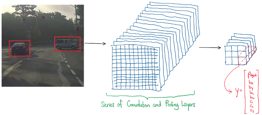 YOLO的工作原理可通过图示说明。假设有一张道路车辆图像,将其划分为3×3的网格框,此时构建的CNN输出维度为3×3×通道数,每个通道包含如下向量: