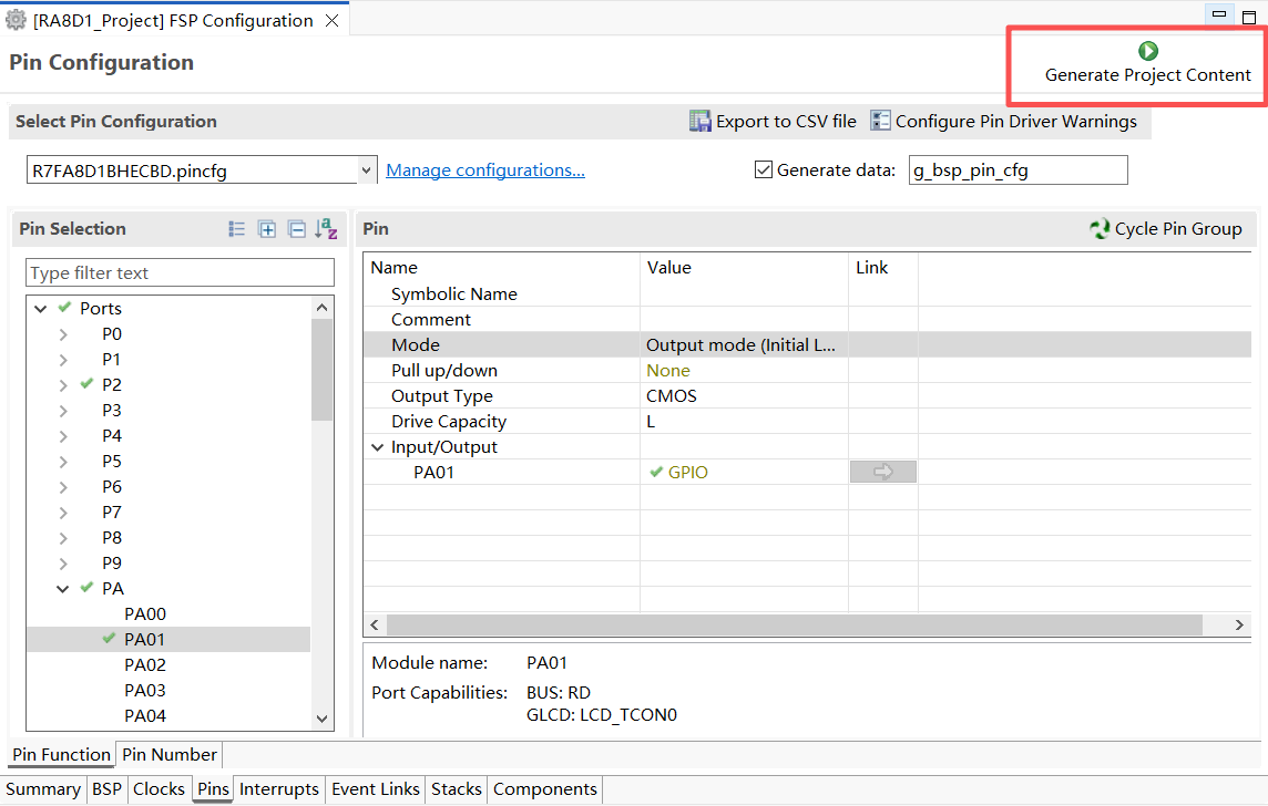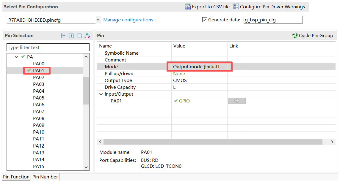 我们在Pins界面中,将PA1引脚配置成拉低输出。