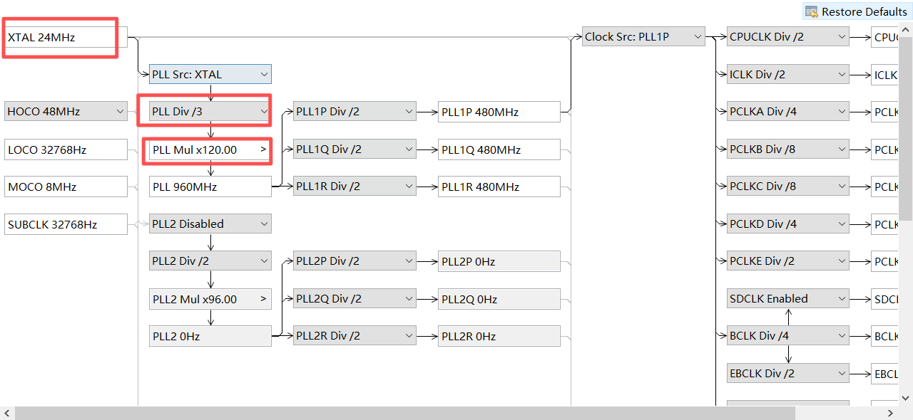 (7)我们需要修改一下时钟,配置开发板晶振频率为24M,倍频也修改下,改下面这三个位置,其他时钟暂时默认。