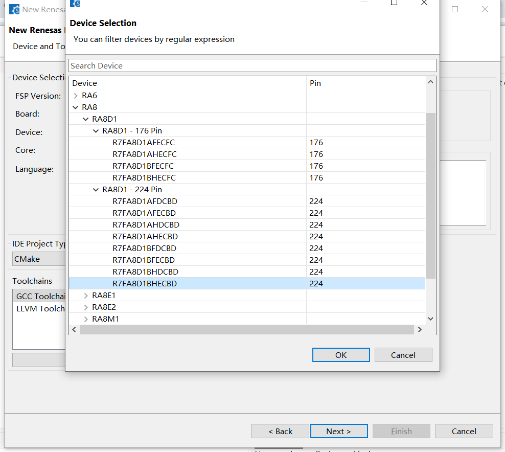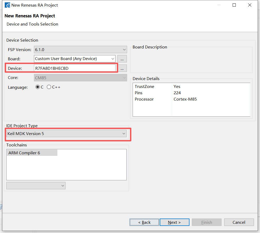 (2)选择芯片型号。我们这款套件的型号是R7FABD1BHECBD。