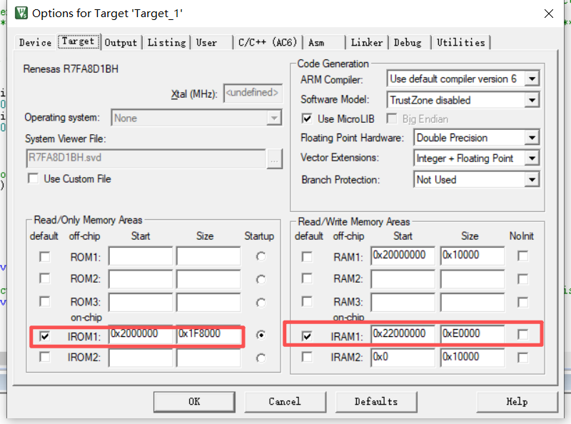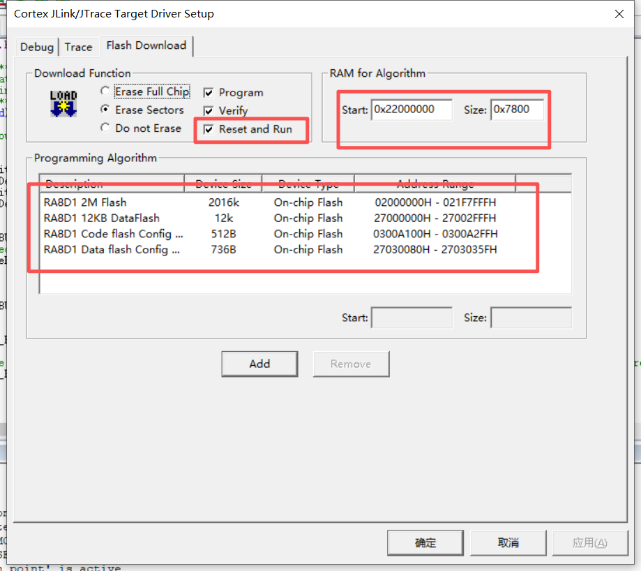 打开项目以后,我们这个时候编译项目就不会报错,但是,但是,下载出现了问题,虽然选择了JLINK,RW,但是下载的时候依然报错,后来找到了原因,是RASC搭建好的项目没有为我们配置好Target中的IRAM,IROM,以及下载器配置中的FlashDownload。两个解决办法,第一种是按照我下图的配置自己配置一下,另外一个解决办法是先将Device换一个CPU型号,再换回来,就有默认的配置了。